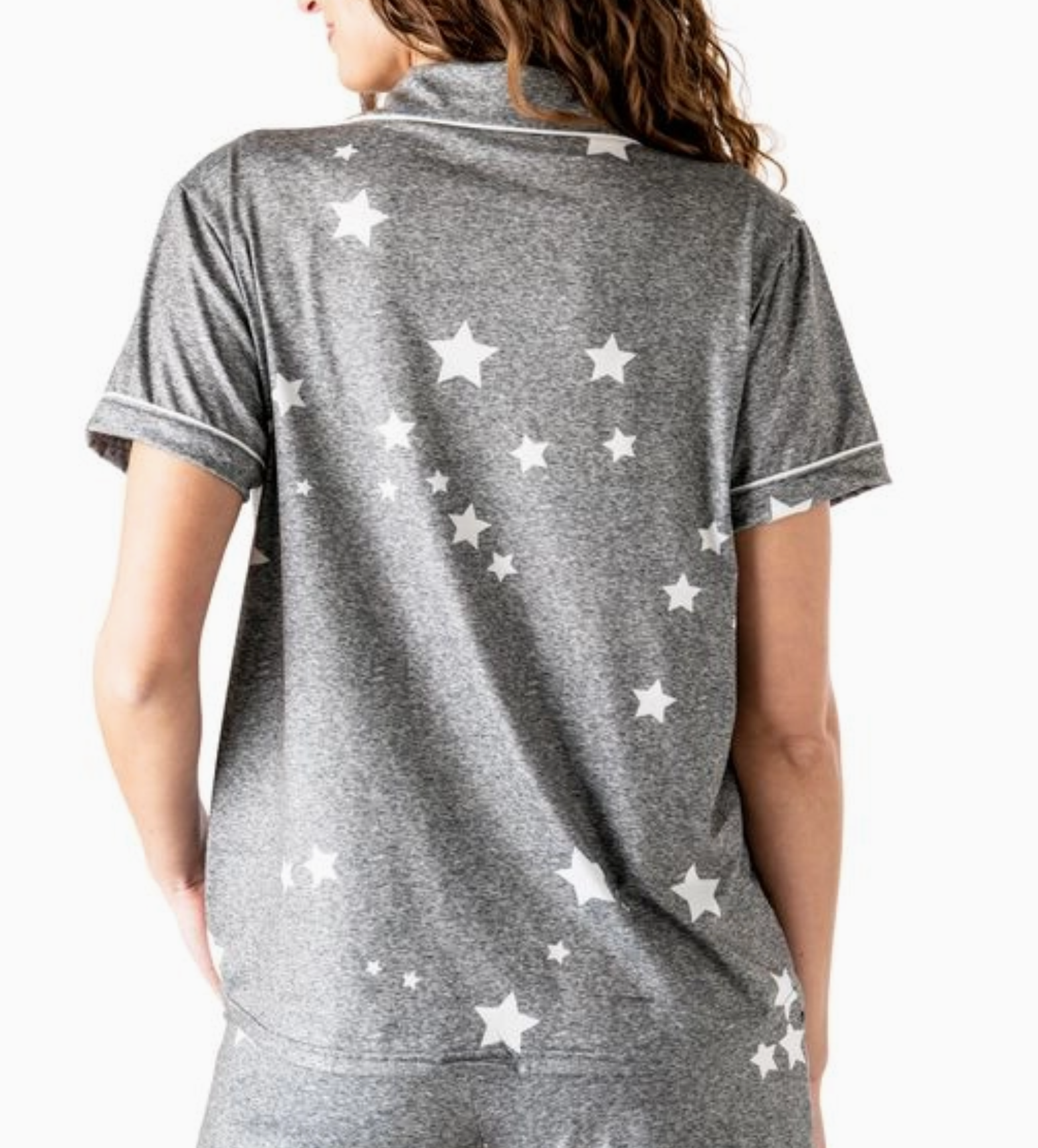 Searching for the ultimate cozy-meets-classic pajama top? The Starry Night Button Down Pajama Top brings just the right amount of charm to your lounge and sleepwear rotation. Designed in a heathered grey background scattered with crisp white stars, this dreamy pattern makes bedtime feel a little more magical. Crafted from ultra-soft, stretchy fabric, it offers comfort you’ll never want to take off. The collared neckline, button-down front, and polished piping detail create a timeless silhouette, while the relaxed fit ensures ease whether you’re winding down at night or sipping coffee in the morning. Easy to mix-and-match with pajama pants or shorts, this top is a versatile staple that belongs in every sleepwear drawer.