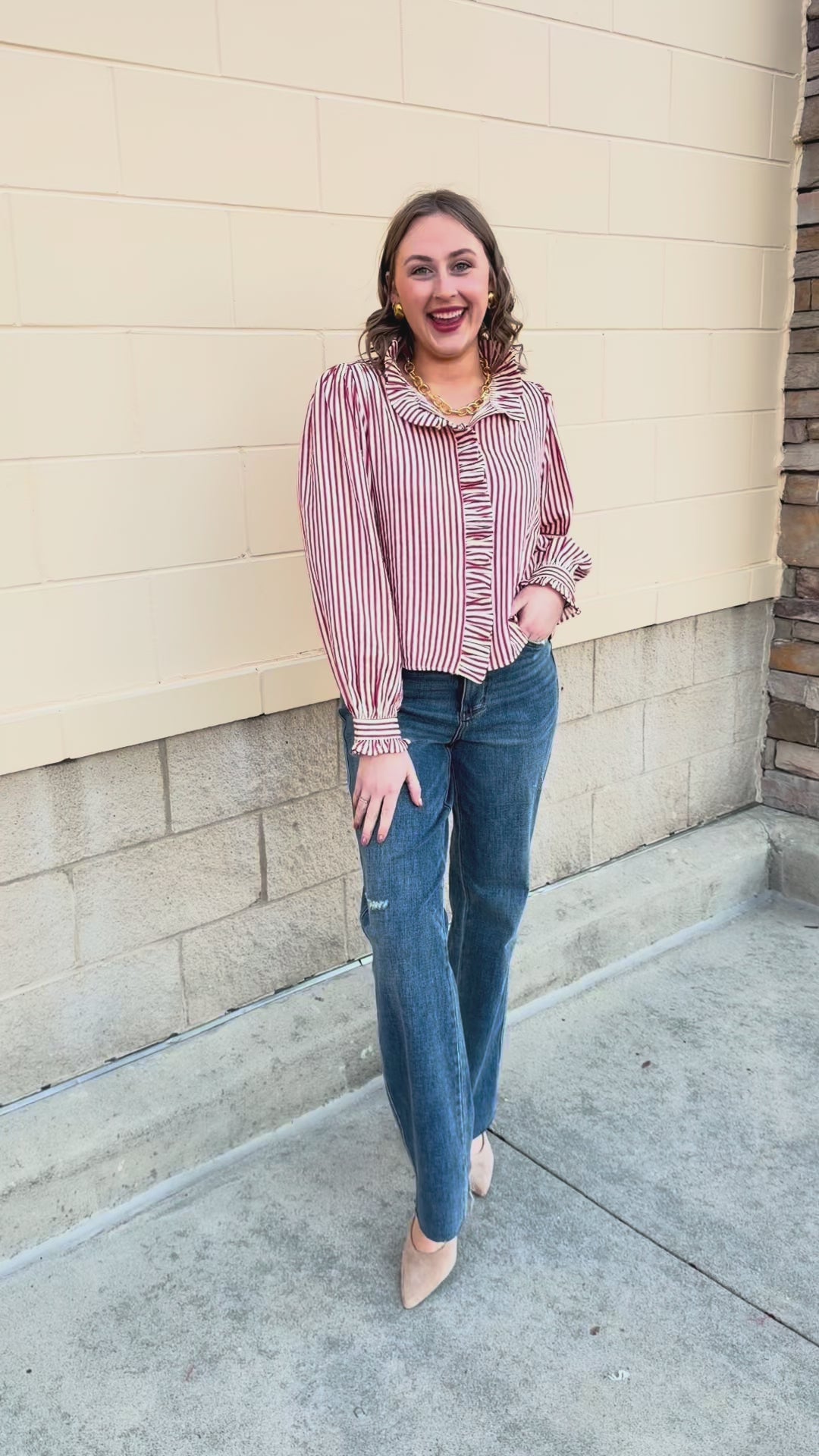 Looking for a holiday top that feels festive without being over-the-top? The Sugarcane Stripes Holiday Seersucker Top is your go-to for effortless cheer. The moment you slip it on, the lightweight seersucker fabric adds a touch of texture and polish, while the classic red and cream stripes create a timeless seasonal look you can wear from workdays to winter gatherings. A softly ruffled collar frames the neckline with feminine charm, paired with a button-down front and cuffed long sleeves that give the silhouette structure and sophistication. Whether you’re styling it tucked into denim or pairing it with a tailored pant, this top brings that subtle holiday magic—pretty, playful, and perfectly chic.
