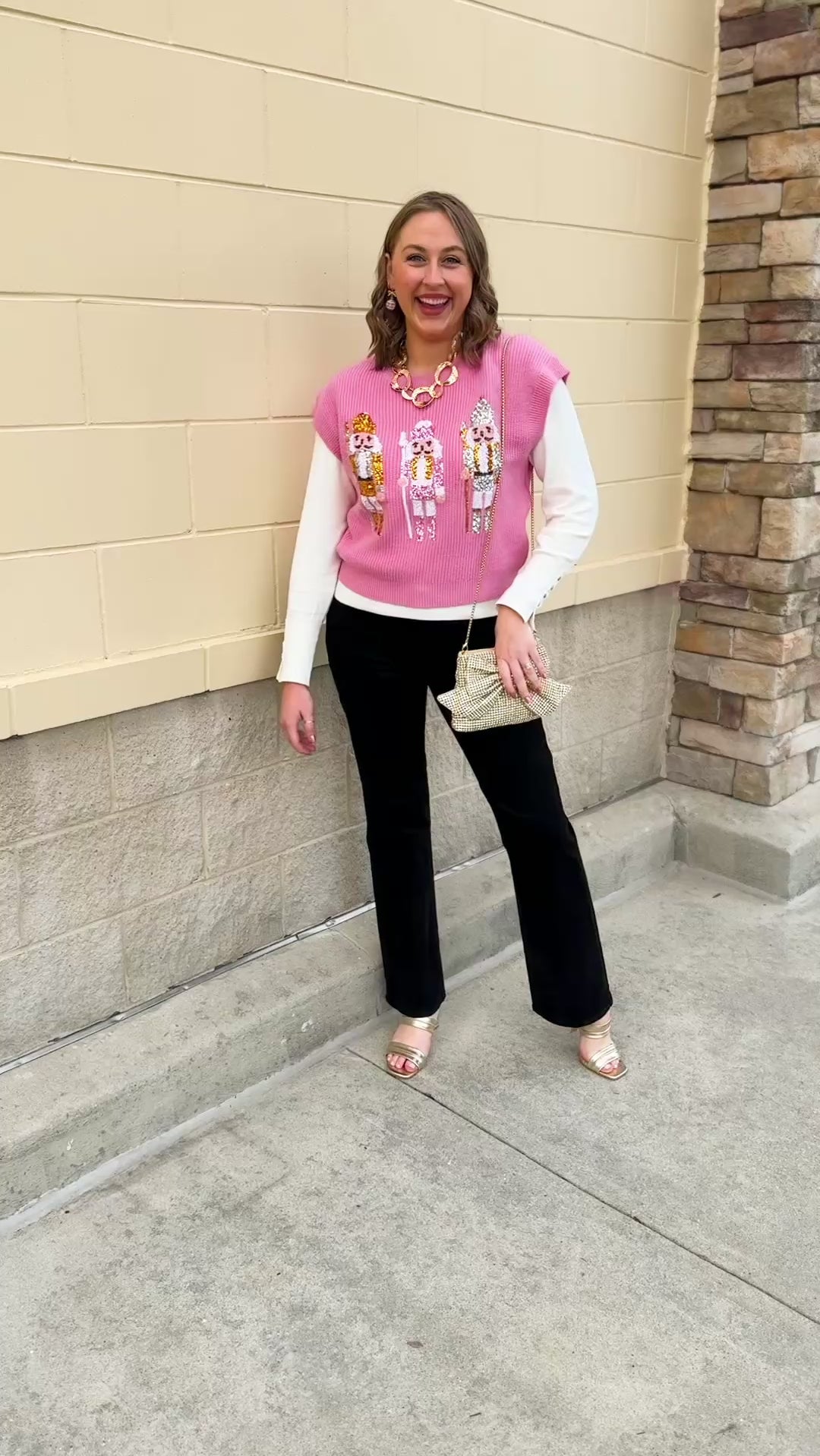 Looking for a playful holiday statement piece that’s both feminine and festive? The Sugarplum Nutcracker Sequin Knit Vest in Pink brings sparkling charm to every holiday moment. Designed in a soft pink knit with a classic crew neckline, this sleeveless sweater vest features sequin-embellished nutcrackers across the front—each one shimmering with personality and Christmas magic.
