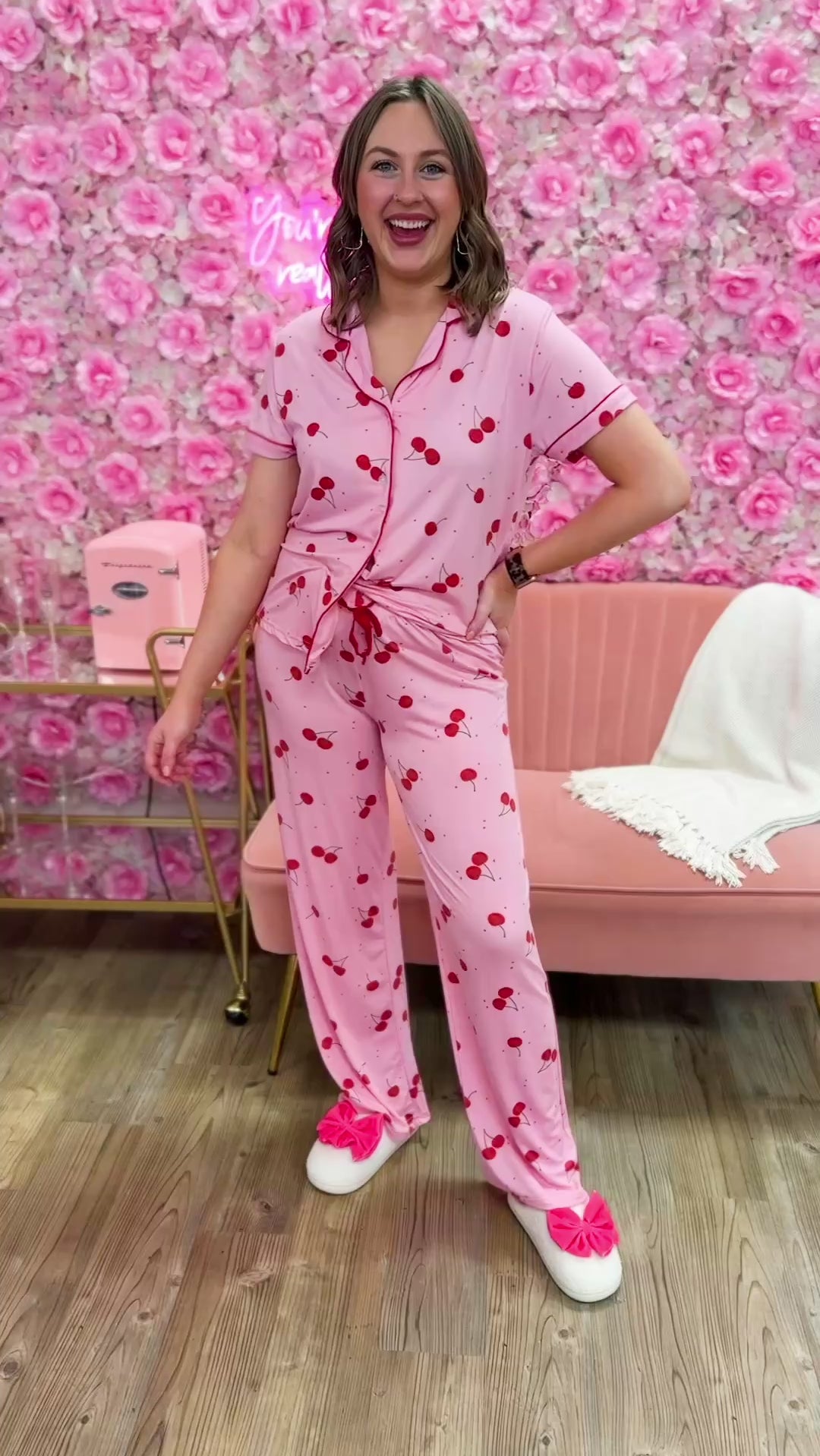 Looking for the perfect pajama pants to keep you cozy yet polished? The Sweet Cherry Wide Leg Pajama Pants bring playful charm and effortless comfort to your lounge lineup. With a soft pink background scattered in cheerful red cherries and trimmed in matching red piping, these pants are as sweet as they are stylish. Designed in ultra-soft, stretchy fabric, they feature a relaxed wide-leg fit that moves with you, plus a comfy elastic waistband with a soft drawstring tie for that just-right fit. Whether you’re pairing them with the matching pajama top for a full set or styling them with your favorite tee, these pants will make every evening feel a little more fun and every morning a little more cheerful.