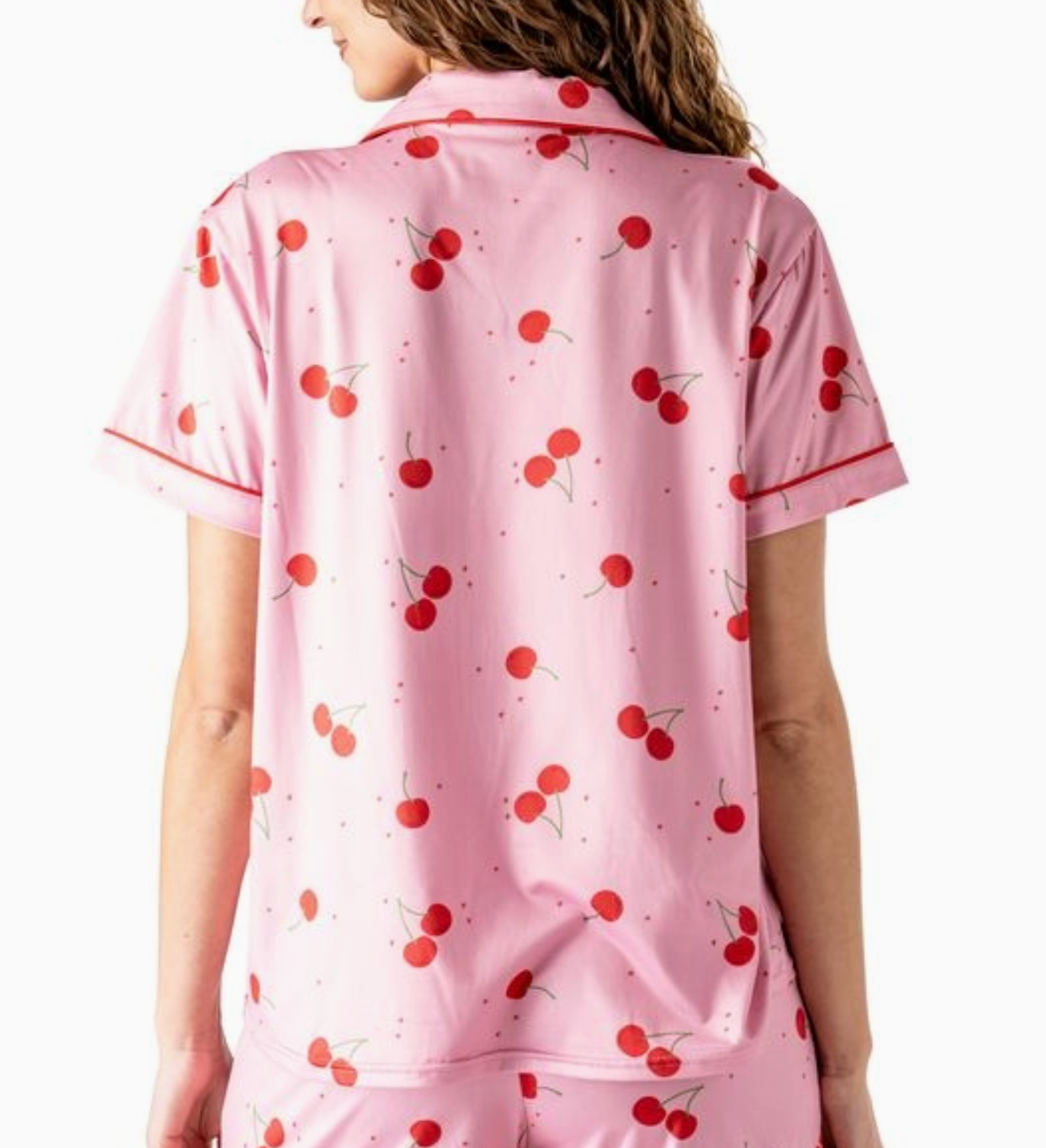 Looking for pajamas that feel as good as they look? The Sweet Cherry Button Down Pajama Top is your answer to effortless comfort and playful style. With a rosy pink background sprinkled with bright red cherries and trimmed in contrast red piping, this top is as cheerful as it is cozy. Designed in an ultra-soft, stretchy fabric, it drapes beautifully while giving you the freedom to lounge, snooze, or sip your morning coffee in total comfort. The collared neckline and classic button-down front add a timeless touch, making it easy to wear on its own or layered over a cami. With a relaxed fit that flatters every figure, this pajama top is perfect for mixing and matching with your favorite shorts or pants from the collection. Whether you're winding down for bed or enjoying a lazy Sunday morning, this sweet and polished sleepwear staple will quickly become your go-to.