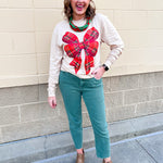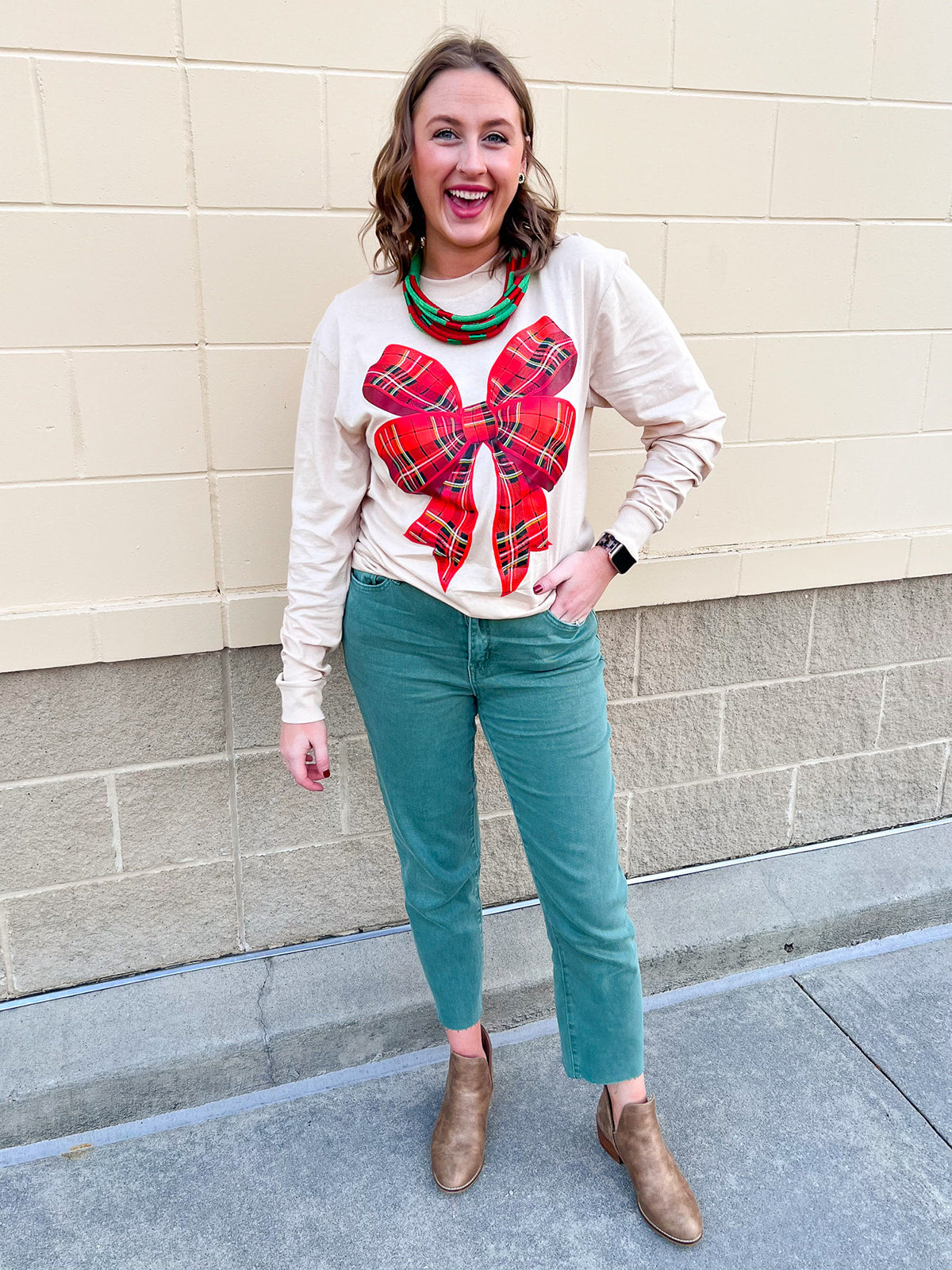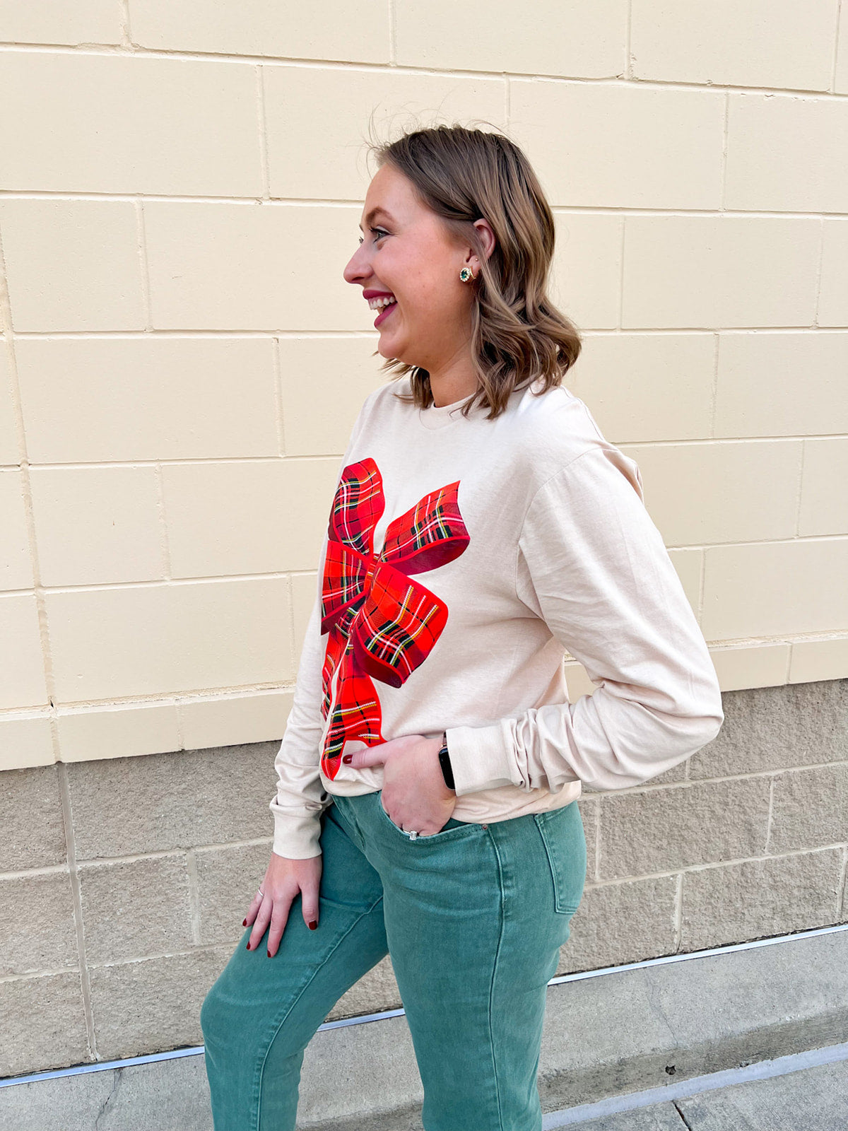 Looking for the perfect festive top that’s comfy enough for everyday wear but still makes you feel cute and Christmas-ready? The Tartan Darling Long Sleeve Graphic Tee brings holiday charm in the sweetest, simplest way. Made in a soft tan cotton blend, this long sleeve crewneck tee features a bold bright red tartan plaid bow graphic—playful, feminine, and instantly festive without feeling over the top. It’s lightweight enough for layering under cardigans and shackets, yet cozy enough to wear on its own for decorating the tree, holiday errands, or casual family photos. The relaxed fit and classic neckline make this a go-to piece you’ll love styling all season long.