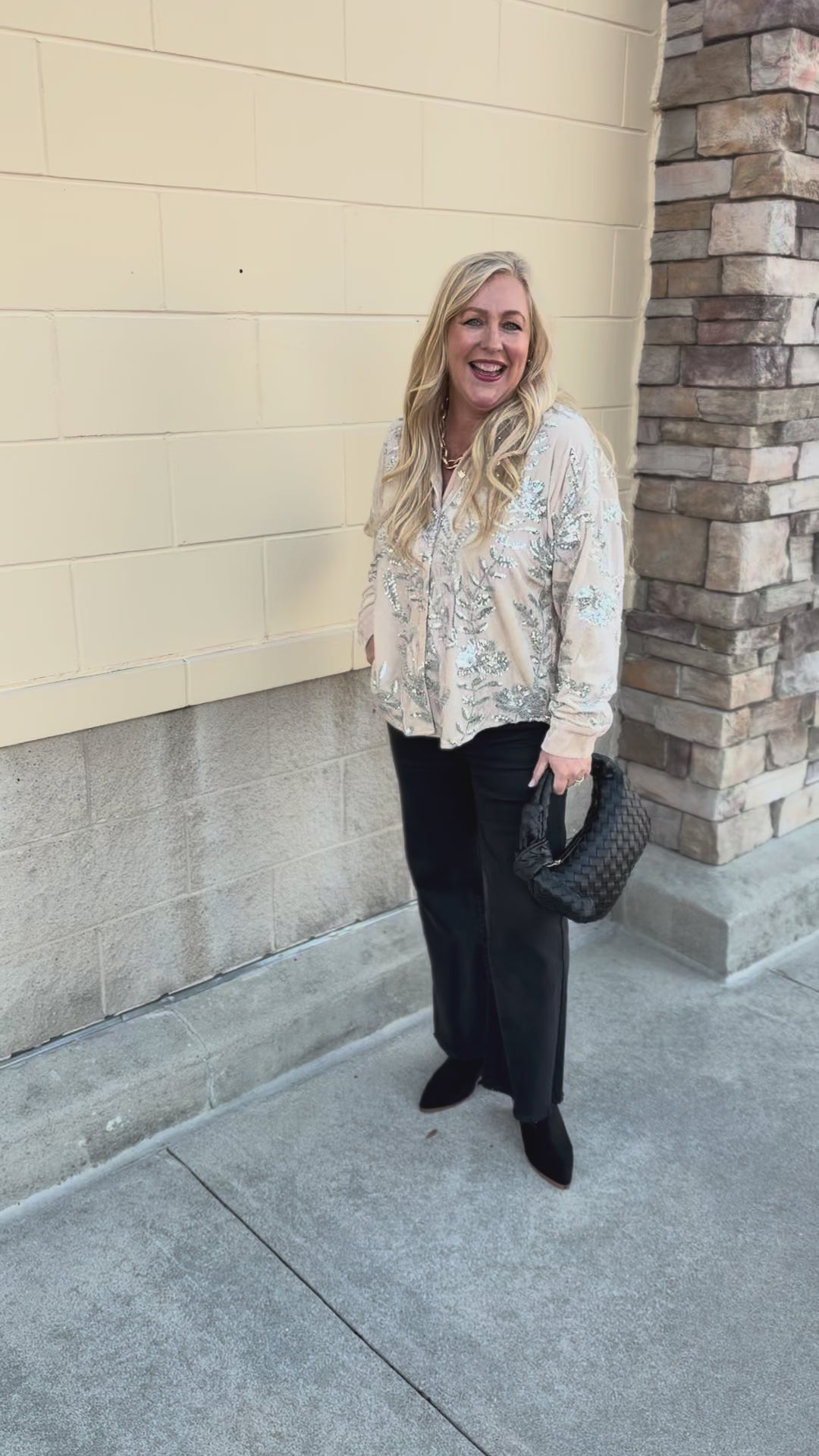 Tuck it into high-waisted trousers or a midi skirt and finish with silver jewelry to complement the sequin detailing. Add heels or ankle boots to complete a chic holiday-ready ensemble.