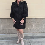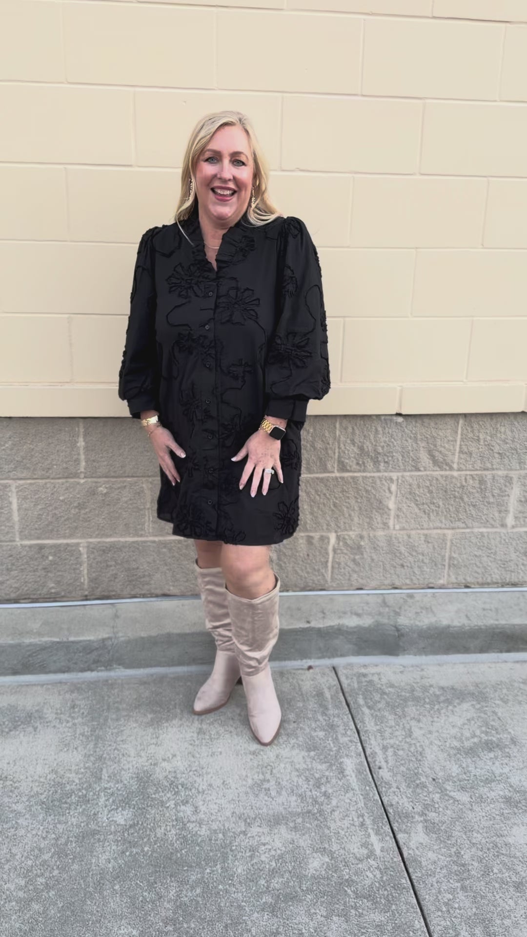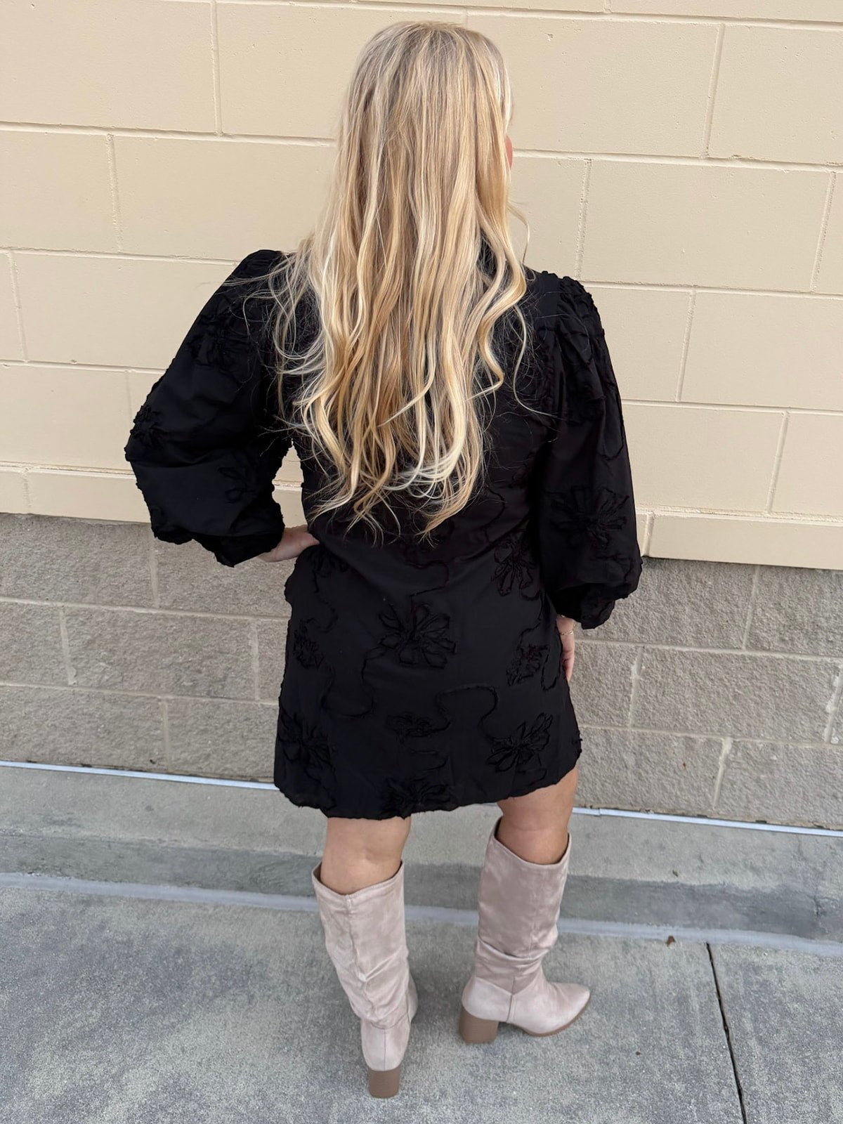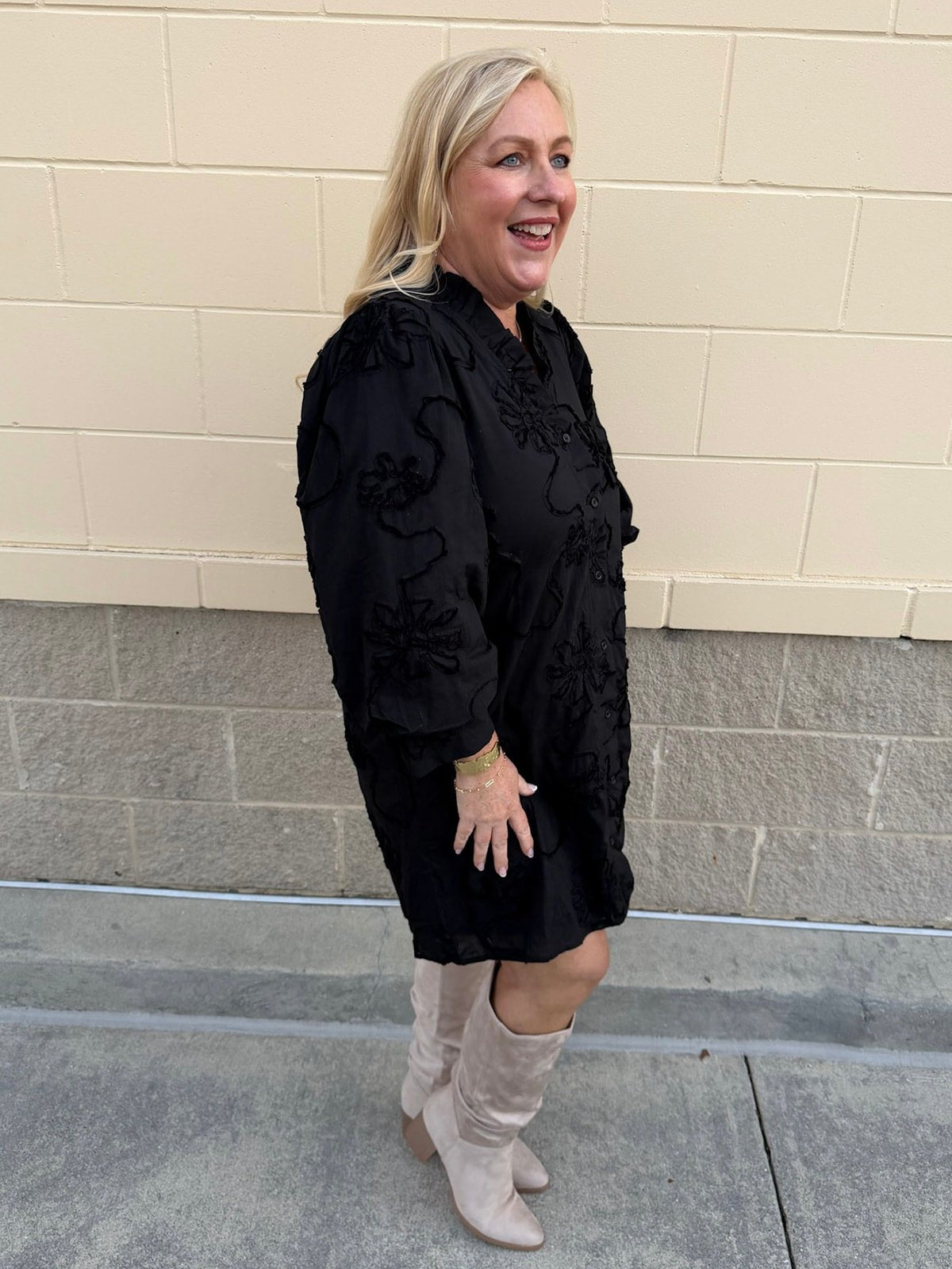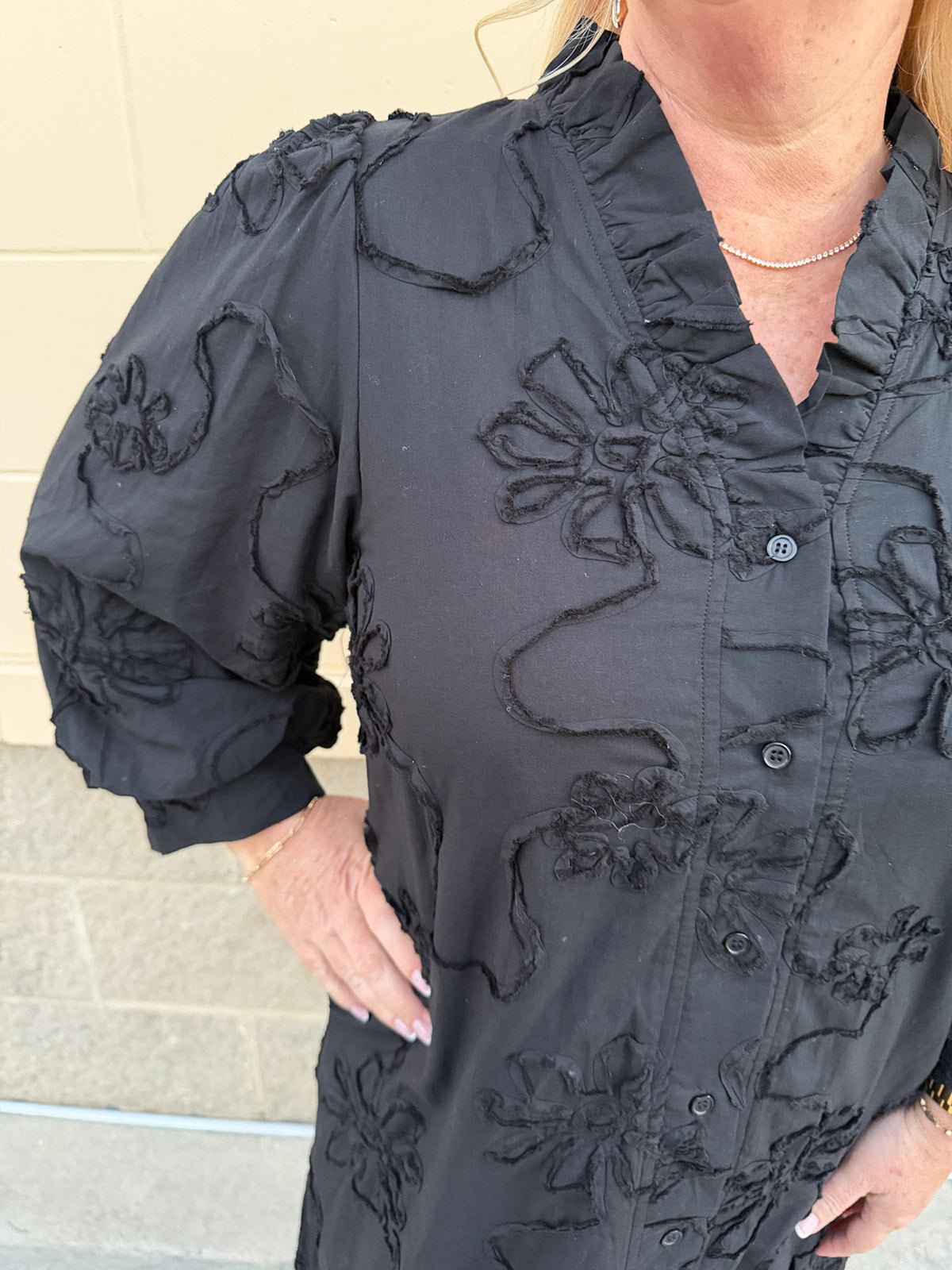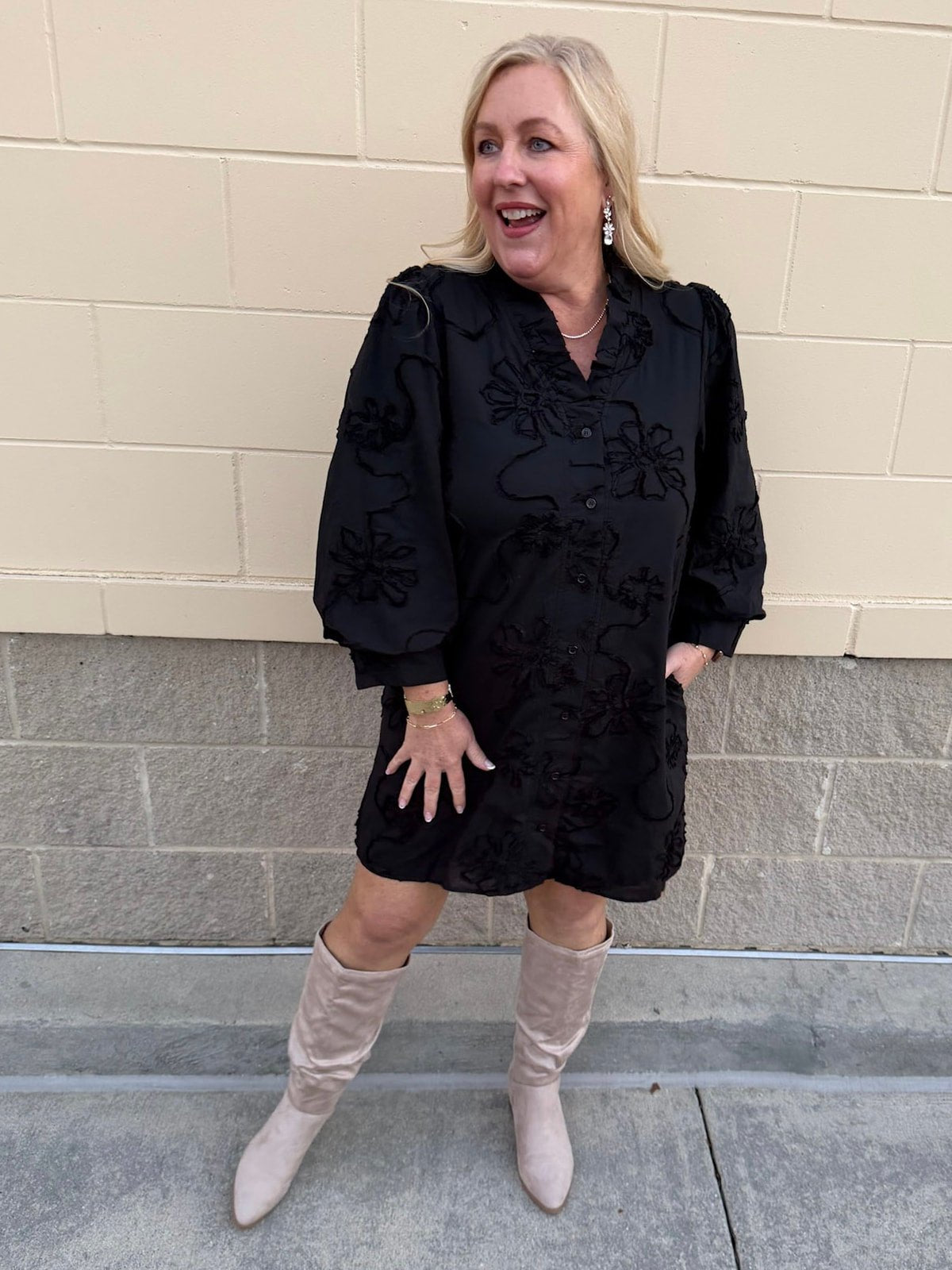 Designed with ¾-length puff sleeves and a softly ruffled neckline, this button-down mini dress features intricate 3D floral detailing that adds stunning depth and dimension. The classic black tone makes it a versatile transitional piece—perfect with boots for a daytime outing or heels for a polished evening look. Cuffed sleeves, side pockets, and a full lining ensure both comfort and practicality, while the flowy mini length provides a feminine, flattering silhouette.