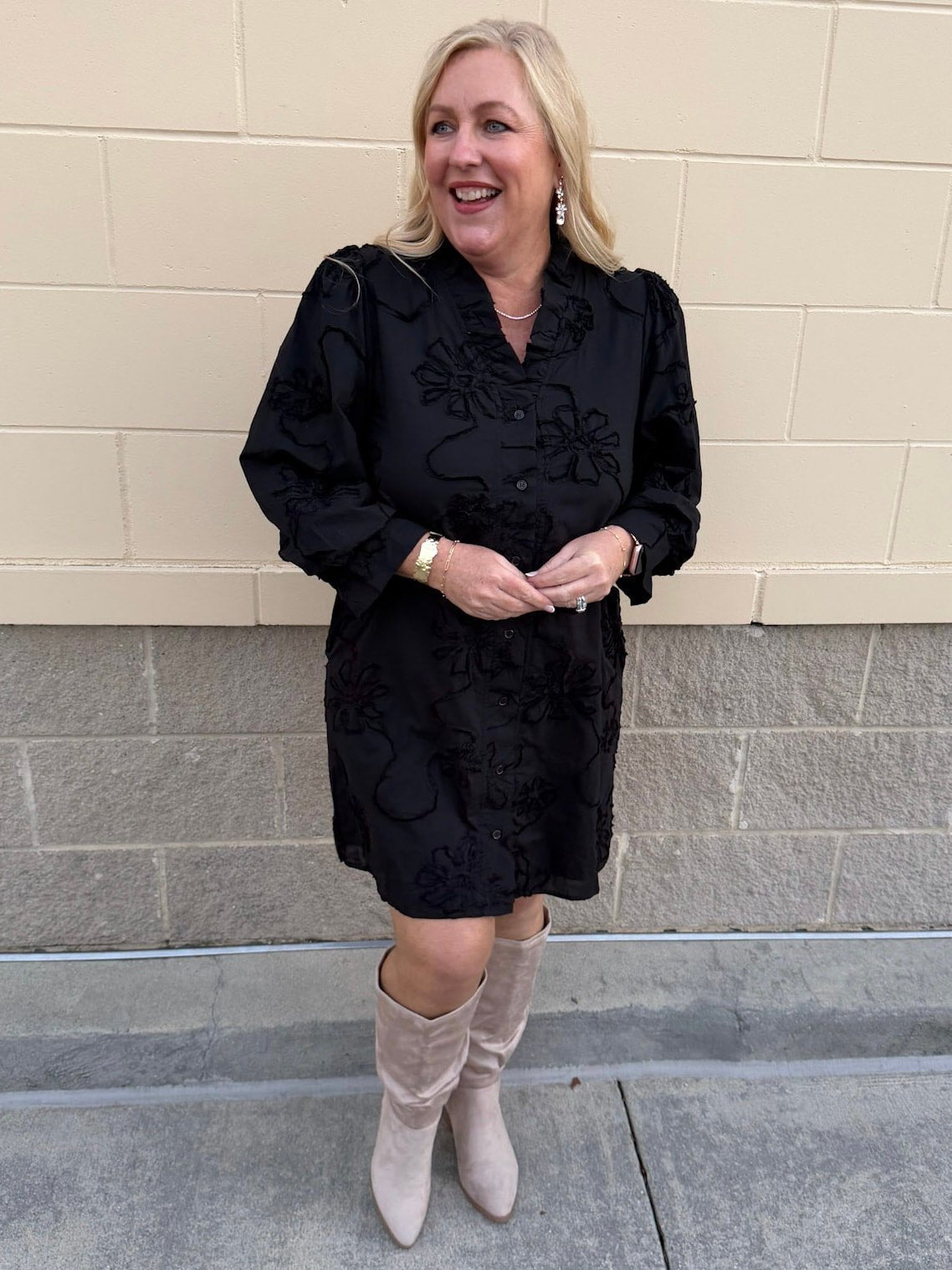 Looking for the perfect fall dress that feels effortlessly feminine and beautifully detailed? The Bloom Haven 3D Floral Mini Dress in Black brings the same romantic charm as the brown version, now in a sleek, versatile hue that’s perfect for seasonal styling or evening occasions.