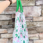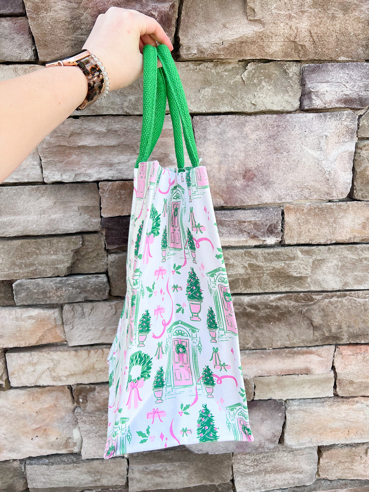 Set on a crisp white background, this wine tote features the same whimsical print as the beloved Holiday House collection: pink front doors with green wreaths, potted Christmas trees in pink pots, scattered pink presents, and soft ribbons accented with green holly berries. The repeating design feels joyful and refined, while coordinating green handles add a sweet pop of color. Designed to fit a standard wine bottle, it’s the perfect way to wrap up a hostess gift or bring a little The Power of Feeling Pretty™ to your holiday gatherings.