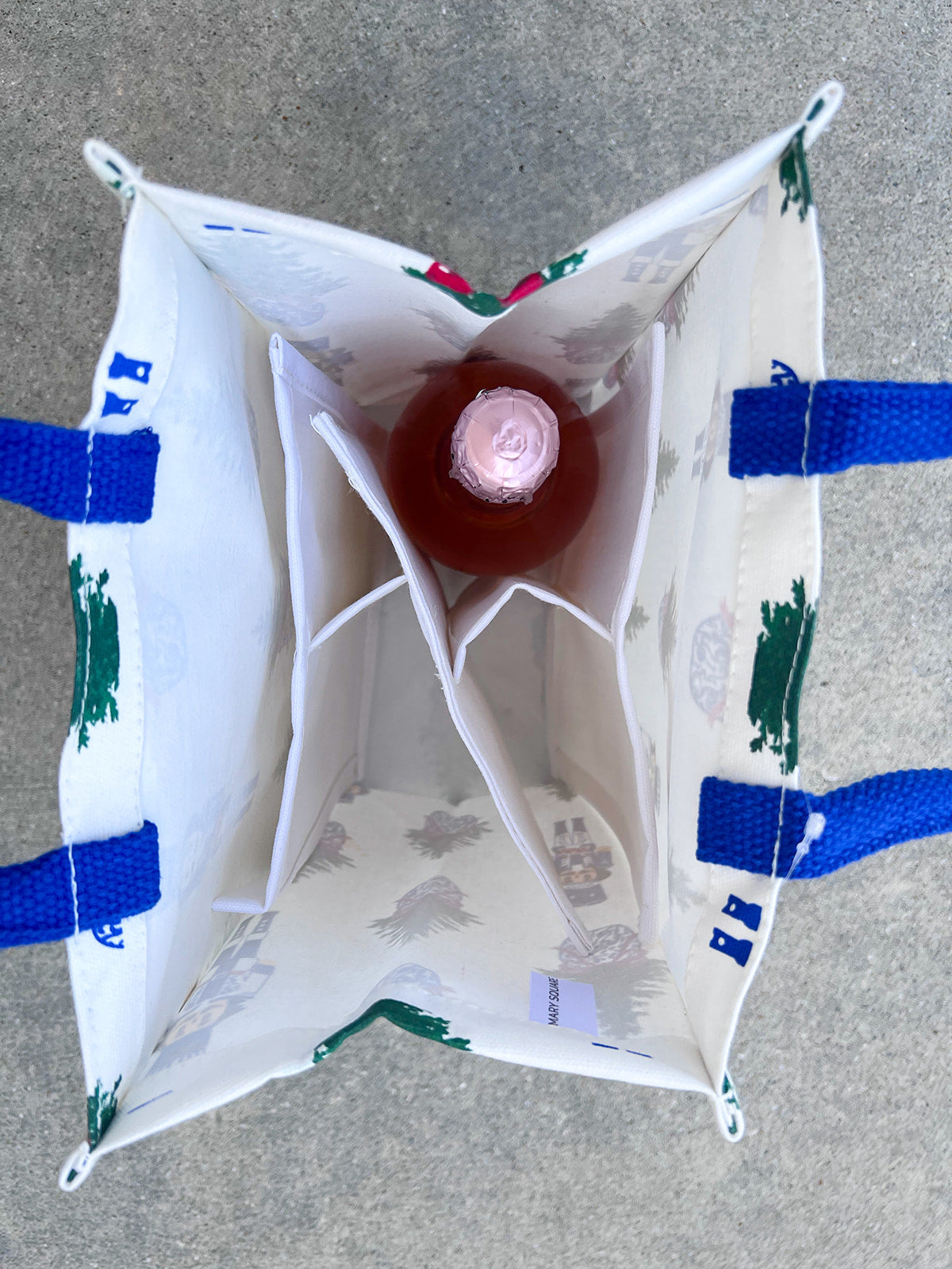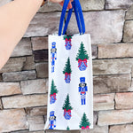 This festive white wine tote features the signature Nutcracker Dreams print — blue, green, and red nutcrackers alternating with Christmas trees tied with red bows in delft-inspired pots. A coordinating set of blue handles makes it easy to carry, turning any bottle into a beautifully wrapped holiday gift.