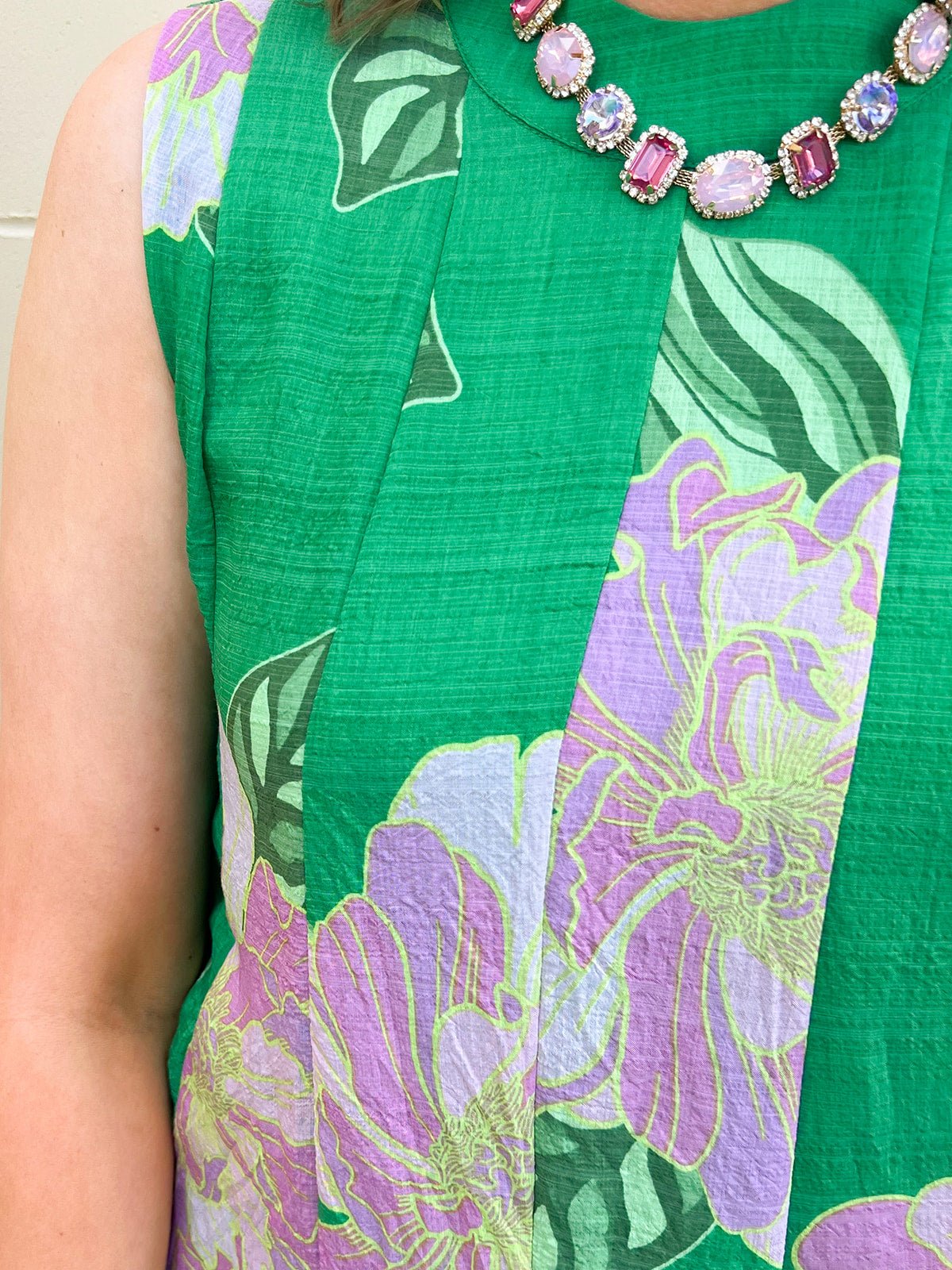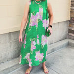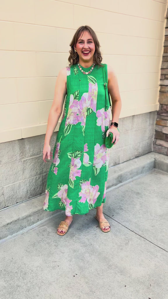 Fresh, feminine, and effortlessly polished—the Meadow Whimsy Midi Dress is the kind of piece you’ll reach for when you want to feel instantly put together. A soft green backdrop sets the stage for delicate light pink florals, creating a romantic color palette that feels like spring in full bloom. The higher neckline adds a touch of sophistication, while the sleeveless silhouette keeps it light and breathable for warm days ahead.