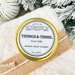 Light up your holiday season with Tidings and Tinsel's signature Tin Candle. Crafted with a festive blend of cinnamon-orange-cranberry, this luxurious candle is presented in a stunning gold tin, making it the perfect gift for this special season. Spread the joy with Tidings and Tinsel!
