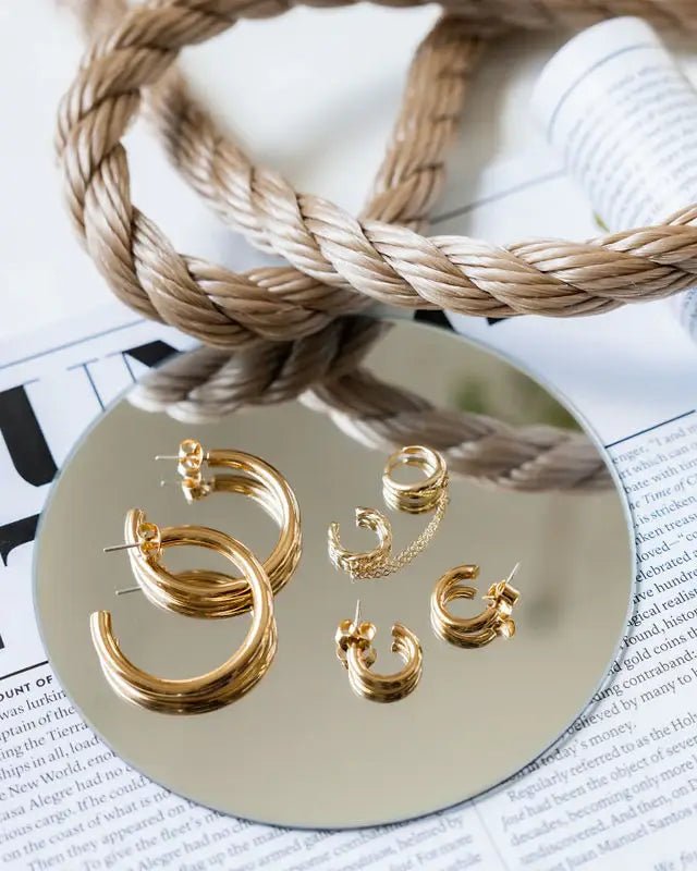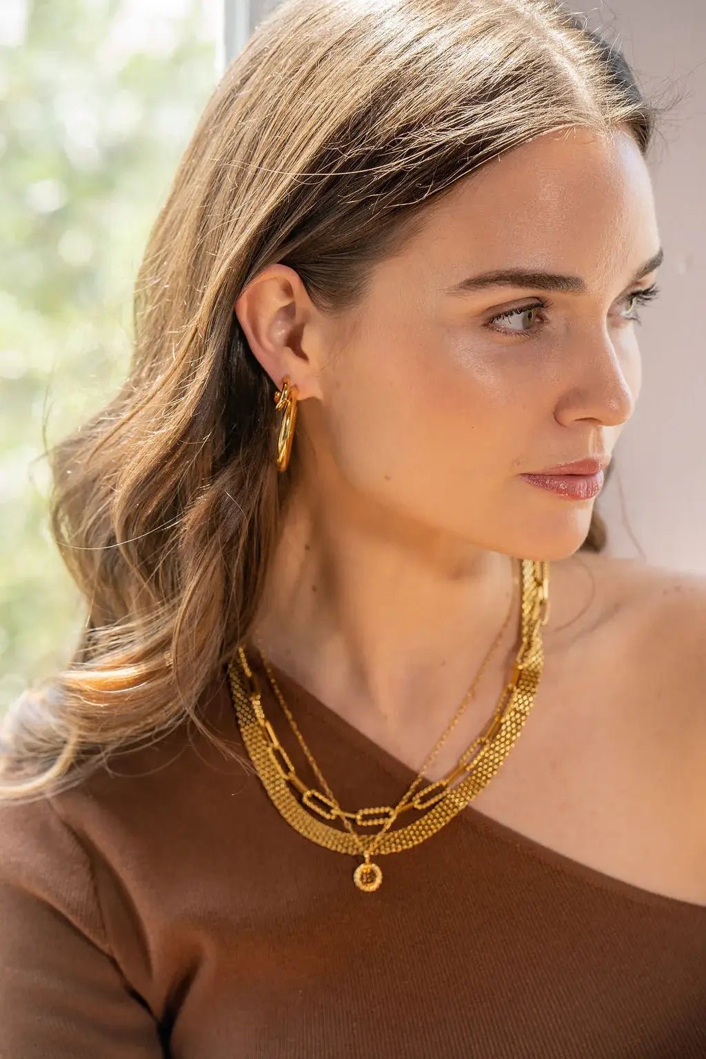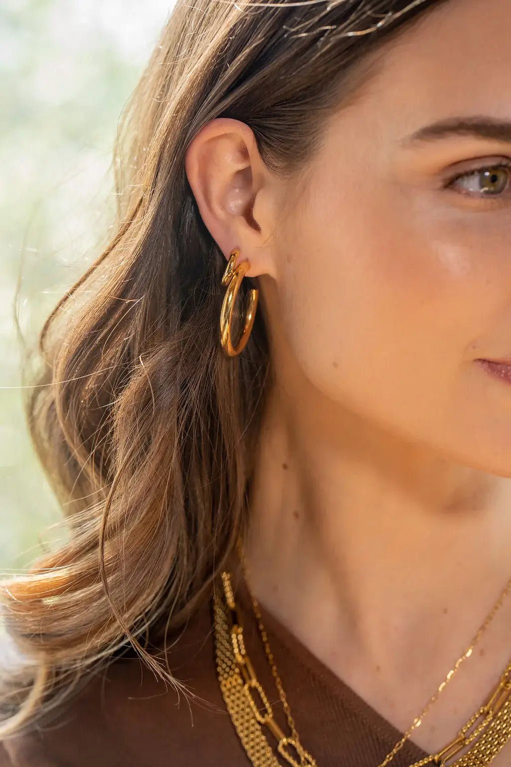 This new sleek design will be your new essential for everyday hoops. The delicate, gold design will forever be a classic. Hypoallergenic, Nickel Free SIZE: 15mm. Thickness 3mm. Closure: Butterfly Back