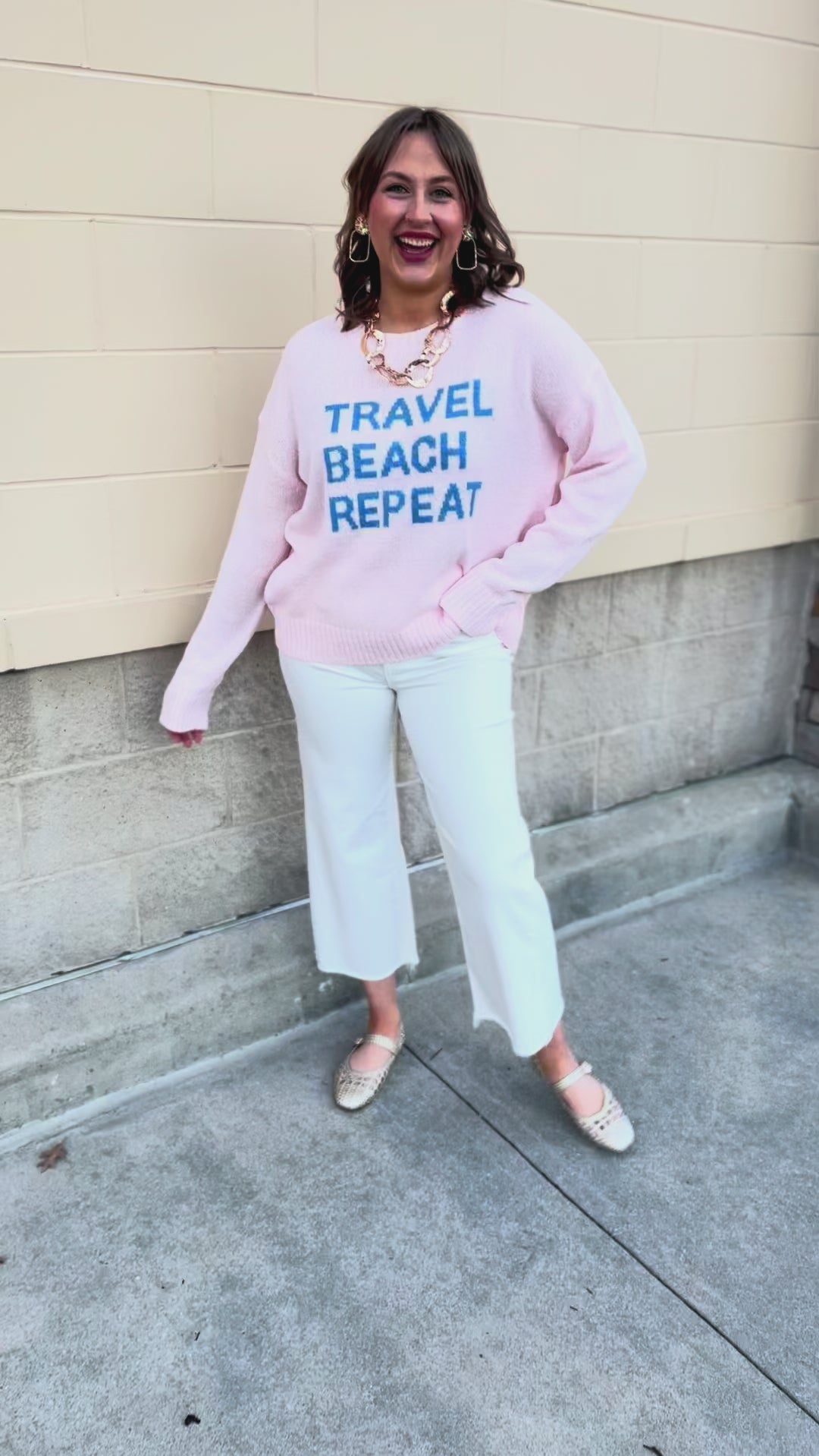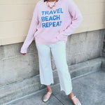 Soft, easygoing, and full of vacation vibes, the Travel Beach Repeat Sweater is made for dreaming about your next sunny escape. This light pink lightweight knit features bold blue block lettering that reads Travel Beach Repeat, giving it a fun and relaxed feel that’s perfect for everyday wear. The breathable knit makes it ideal for layering on breezy mornings or cool evenings, while the classic crew neckline and relaxed fit keep it comfortable and flattering. Whether you're packing for a weekend getaway or heading out for a casual day, this sweater adds a playful coastal touch to any outfit.