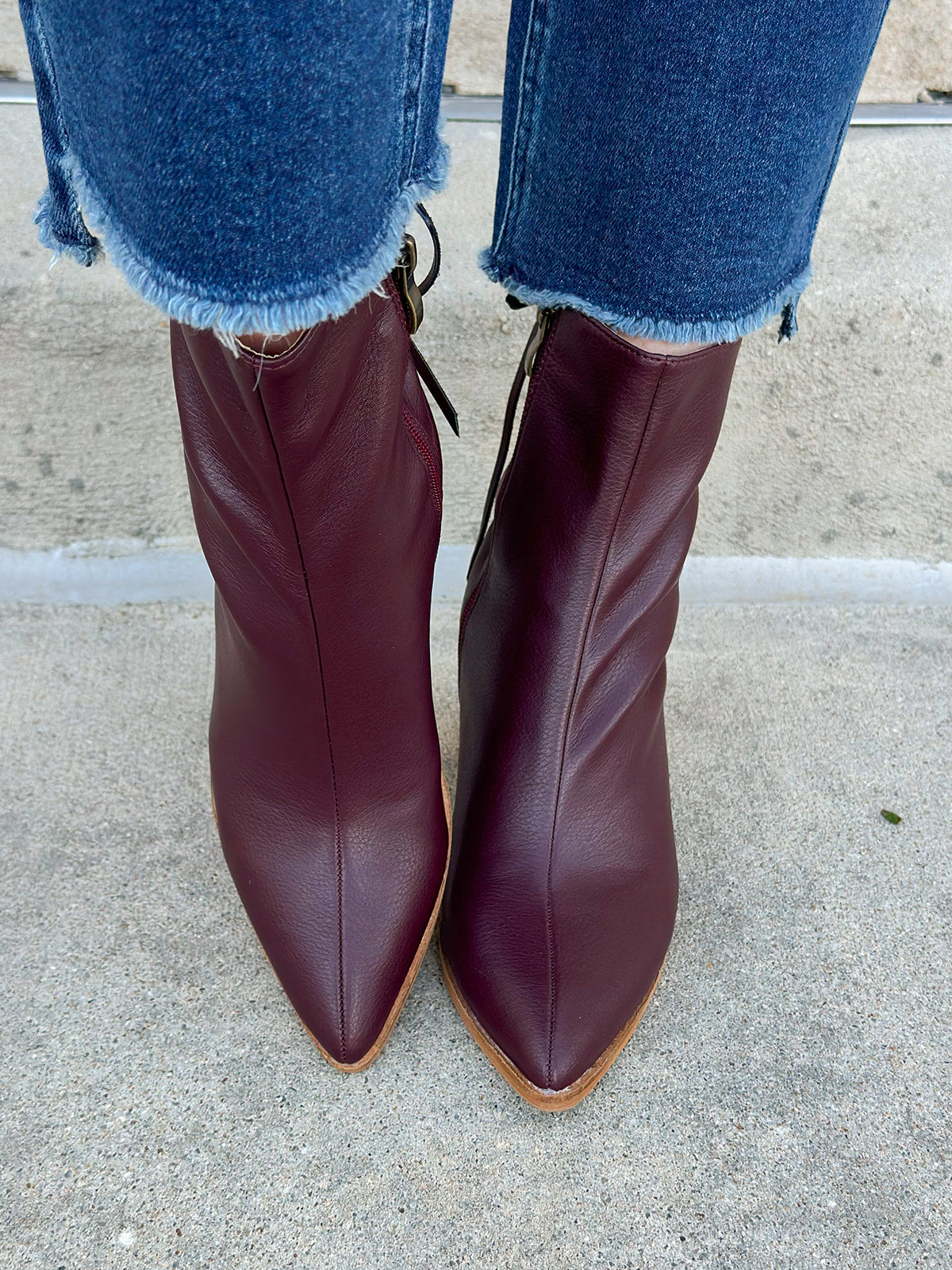 Looking for the perfect ankle boot that blends elegance with modern edge? The Valencia Pointed Toe Ankle Boot in Garnet is a chic statement shoe designed to elevate every outfit. With its sleek pointed toe and unique back lace-up detailing, it brings a touch of sophistication and personality to your look, while the stacked 3-inch heel provides both flattering height and all-day comfort.