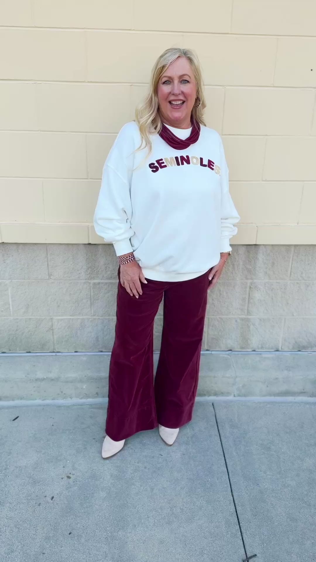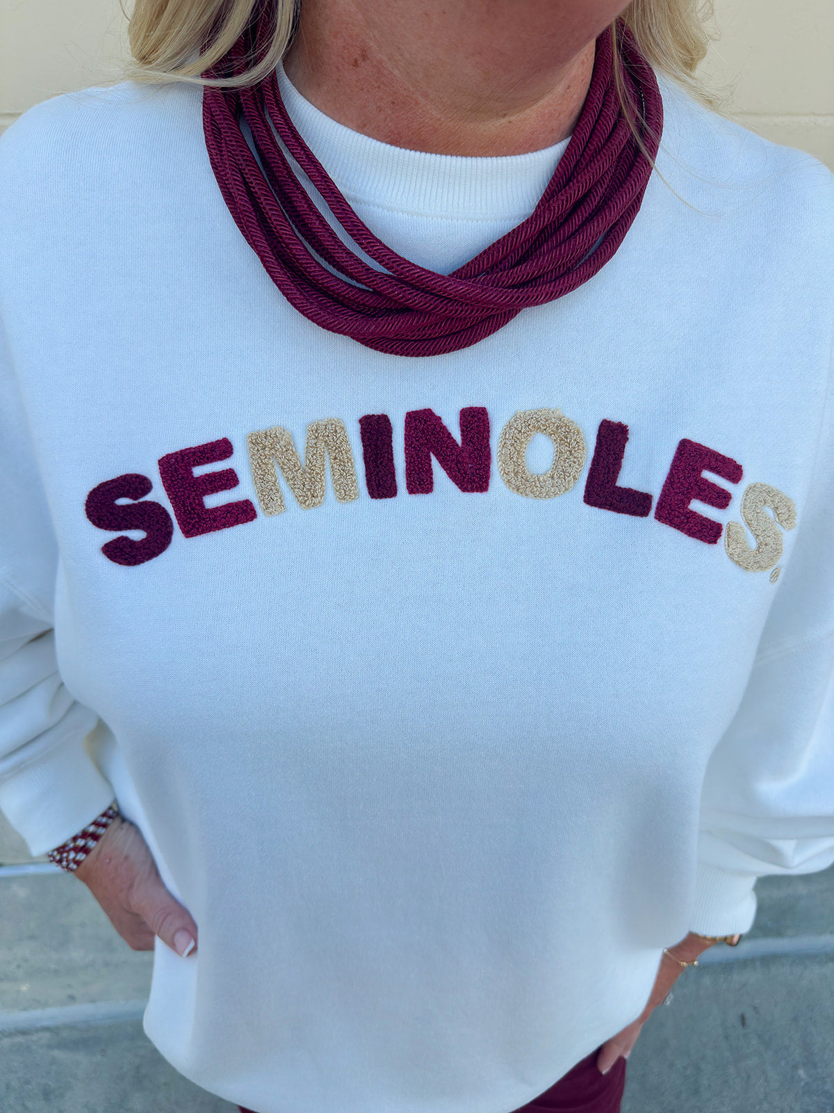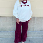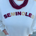 The standout detail is the bold chenille “Seminoles” lettering across the chest. Each letter alternates between two garnet tones and a golden hue, giving it a playful, spirited look that truly pops against the crisp white backdrop. Comfortable, flattering, and full of charm, this crew is your new go-to for showing team pride with a feminine edge.