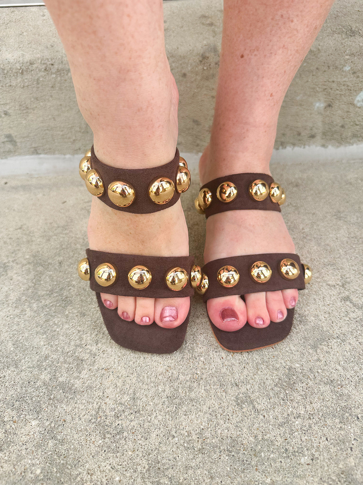Need a chic, everyday sandal that’s as comfortable as it is stylish? The Venus Coffee Block Heel is your go-to for effortless, statement-making style. Crafted with a vegan faux suede upper and oversized dome studs, this two-strap sandal adds just the right amount of edge to any outfit. The low 1.75" block heel ensures all-day wearability, while the padded insole and faux leather lining provide comfort without compromising style. Its slip-on design makes it easy to pair with dresses, jeans, or tailored shorts for a versatile look that transitions seamlessly from brunch to evening outings.