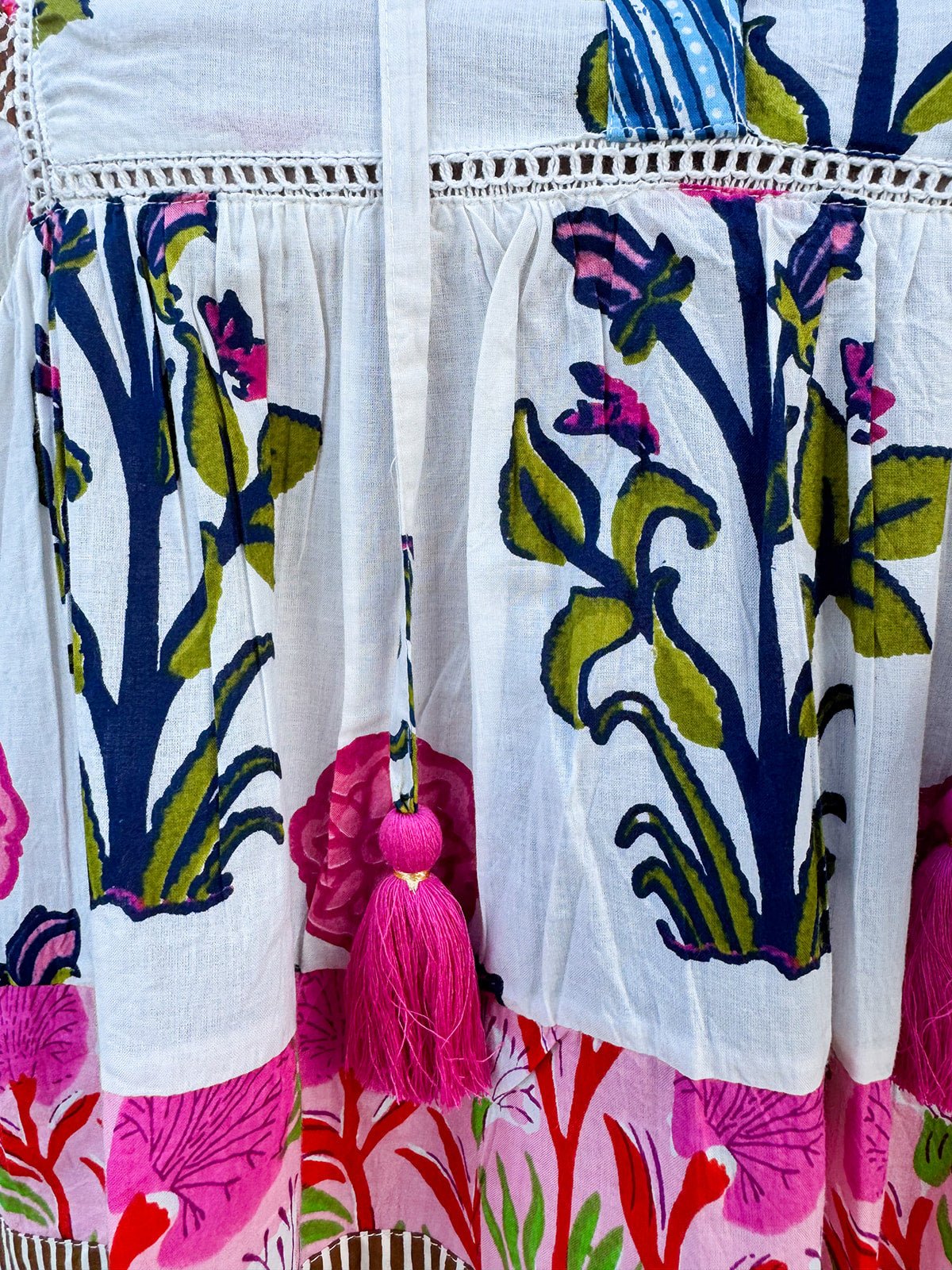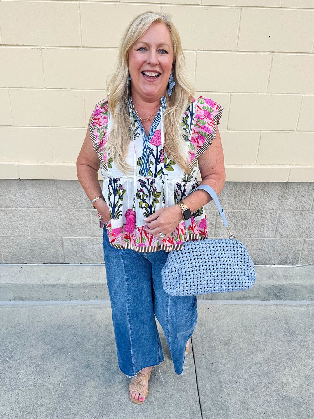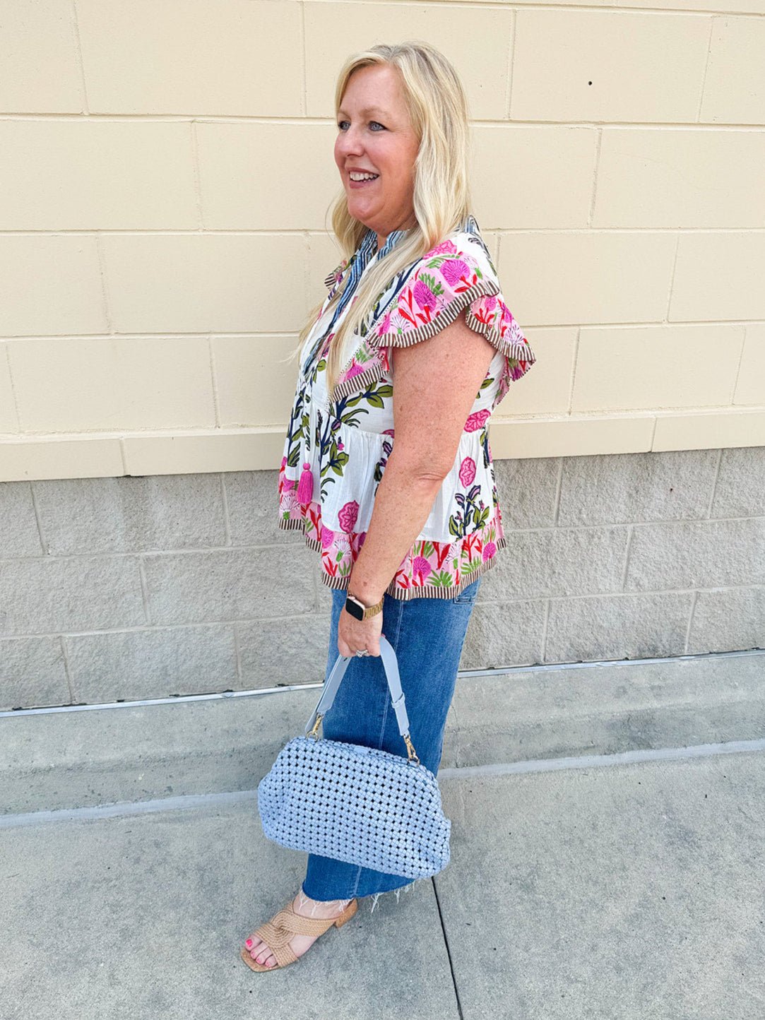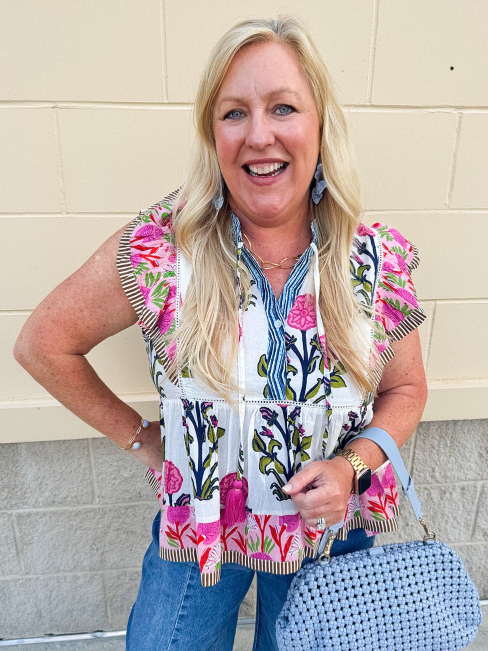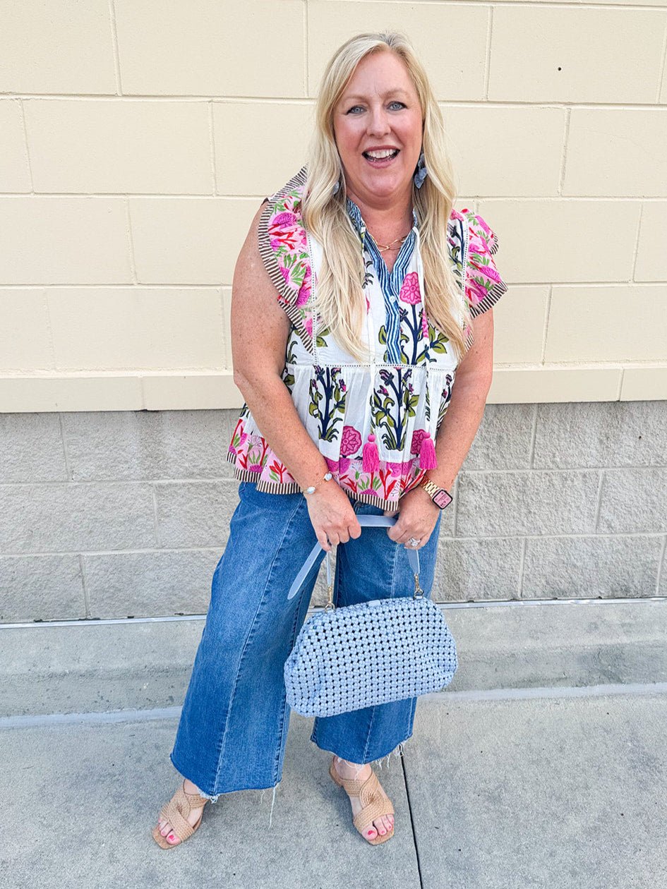 The same dreamy charm you love in the dress—now in a breezy, wear-everywhere top. The Veranda Bloom Flutter Sleeve Top is crafted from 100% cotton and features the same floral pattern in soft pinks, greens, olives, and blues. Delicate flutter sleeves with subtle striped detail frame the silhouette, while a ruffle-trimmed collar and v-neckline add just the right amount of romance. Lightweight and airy, it pairs beautifully with denim, linen shorts, or the matching maxi skirt (if you have it!) for an effortlessly put-together look.