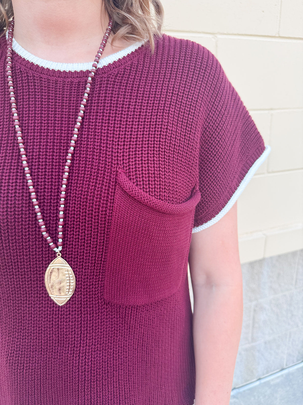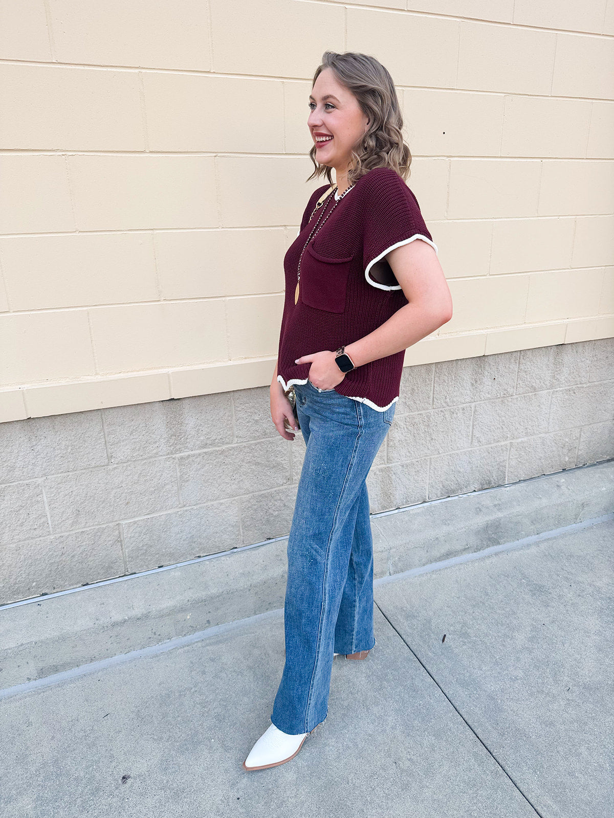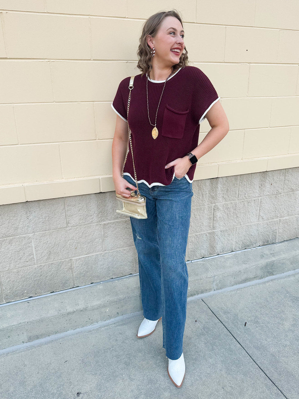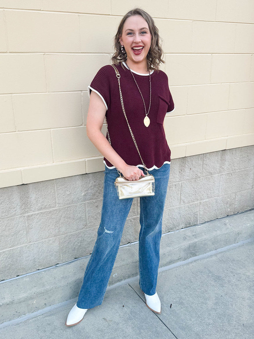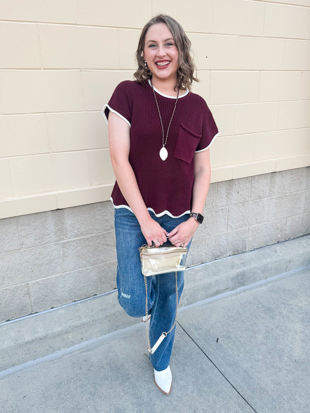Bring cozy charm to your gameday look with the Victory Vibes Scallop Sweater Top. Designed with a relaxed drop-shoulder fit, short sleeves, and a scalloped hem, this knit is the perfect mix of casual and polished. A front side pocket adds a playful touch, while the soft knit makes it effortless to wear from tailgate to touchdown. Whether you’re cheering in the stands or celebrating post-game, this top delivers laid-back spirit with a boutique edge.