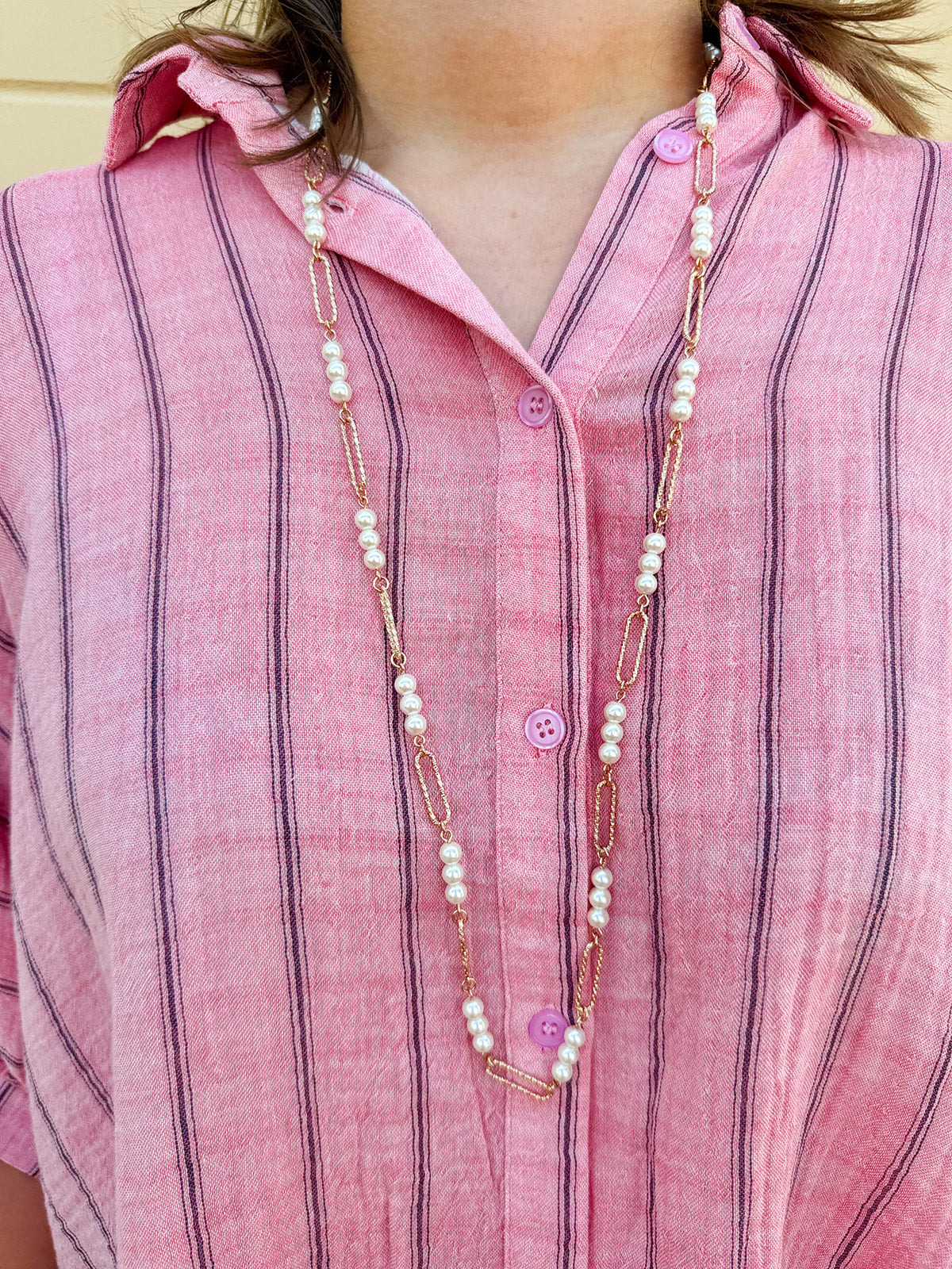 ⢠Pearl beading paired with open oval chain links