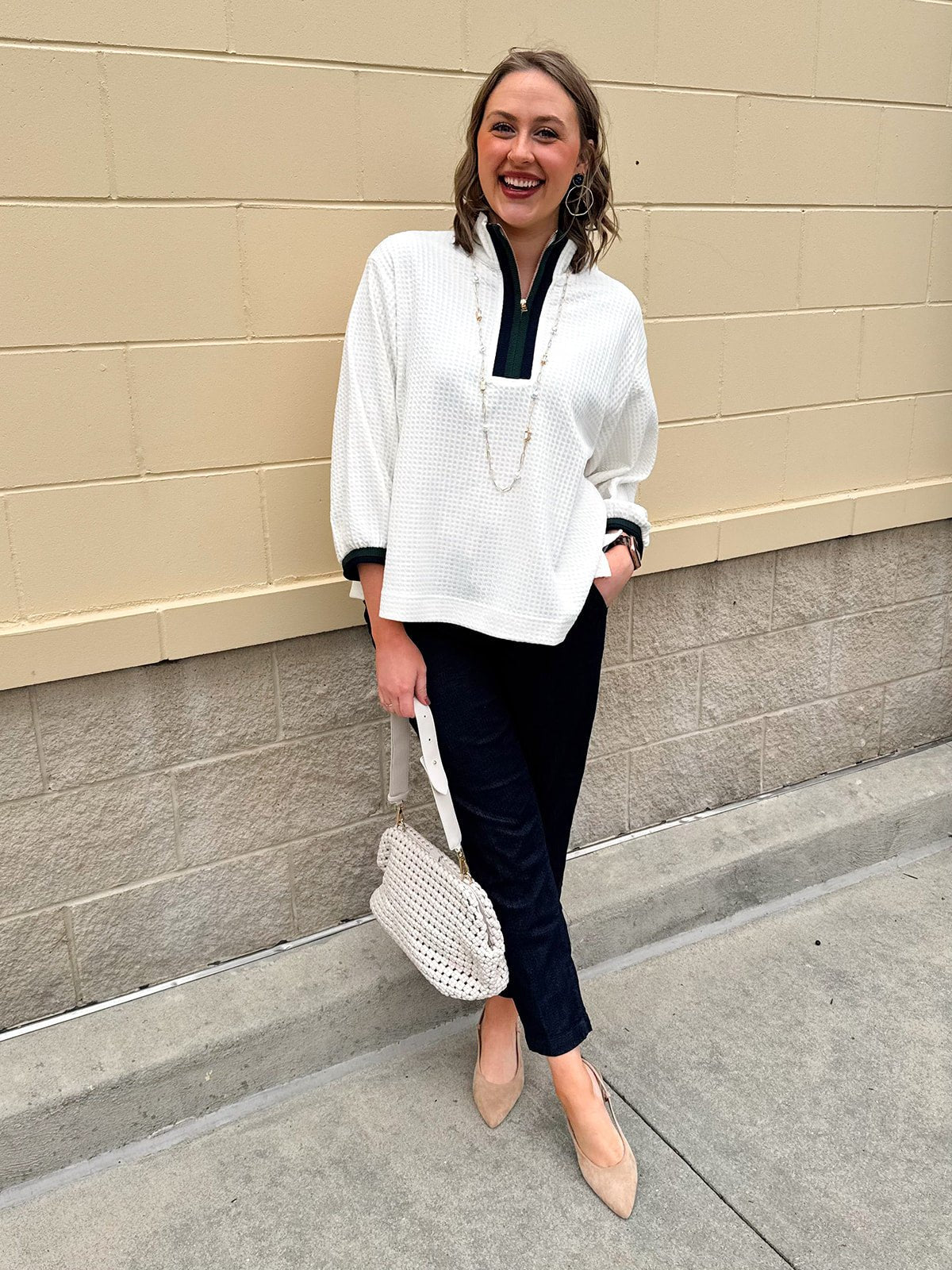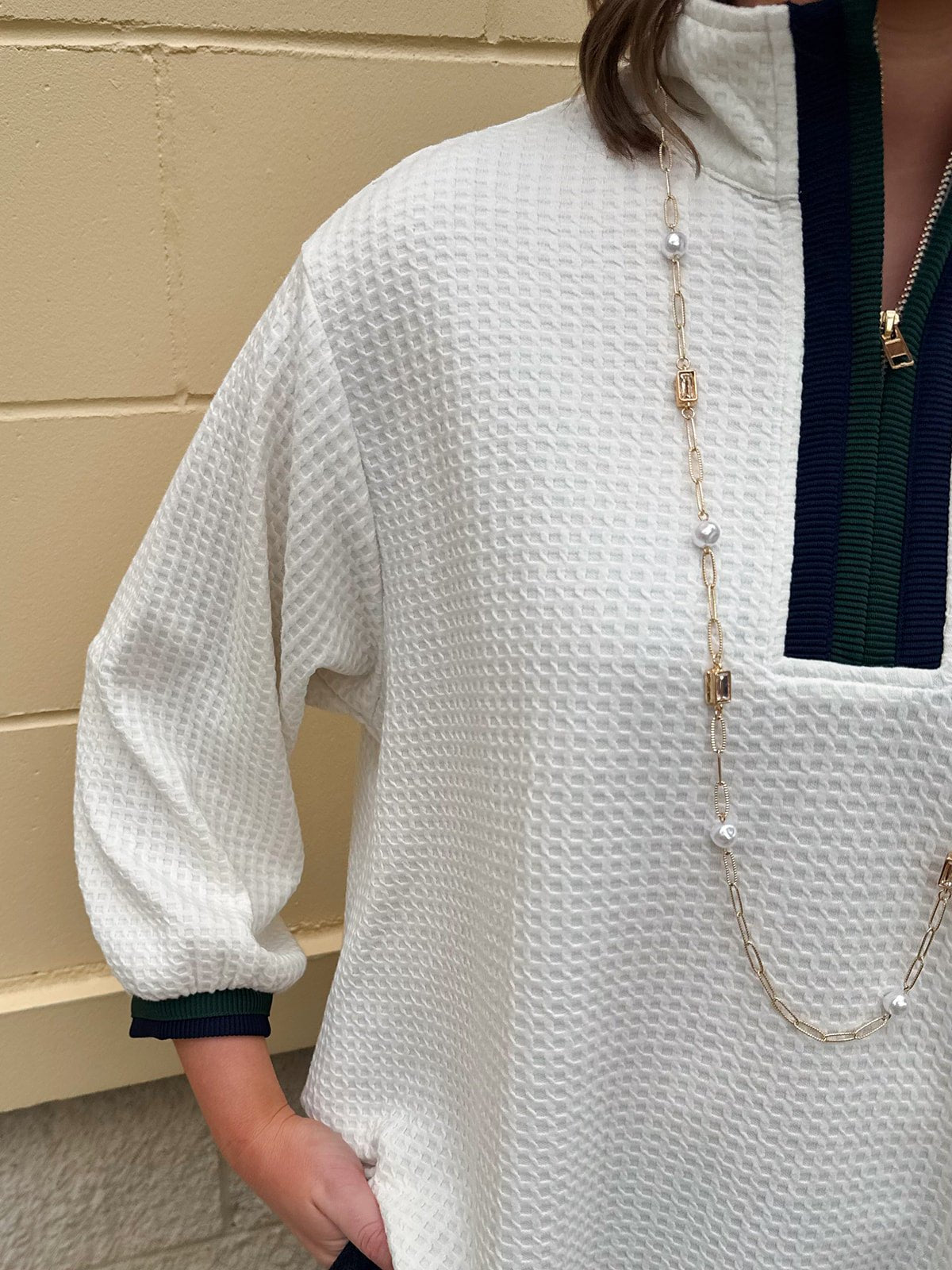Sporty meets stylish in the Weekend Courtside Quarter-Zip Pullover, your new go-to for casual days with a boutique twist. Designed in a soft ecru waffle texture, this top brings a cozy feel with a polished look. The standout detail? A bold navy and green color block accent framing the zipper, adding a fresh pop of contrast. Finished with ¾ length sleeves and banded navy cuffs, it’s easy to throw on and go—whether you're running errands, catching a flight, or just keeping it cool and comfy.