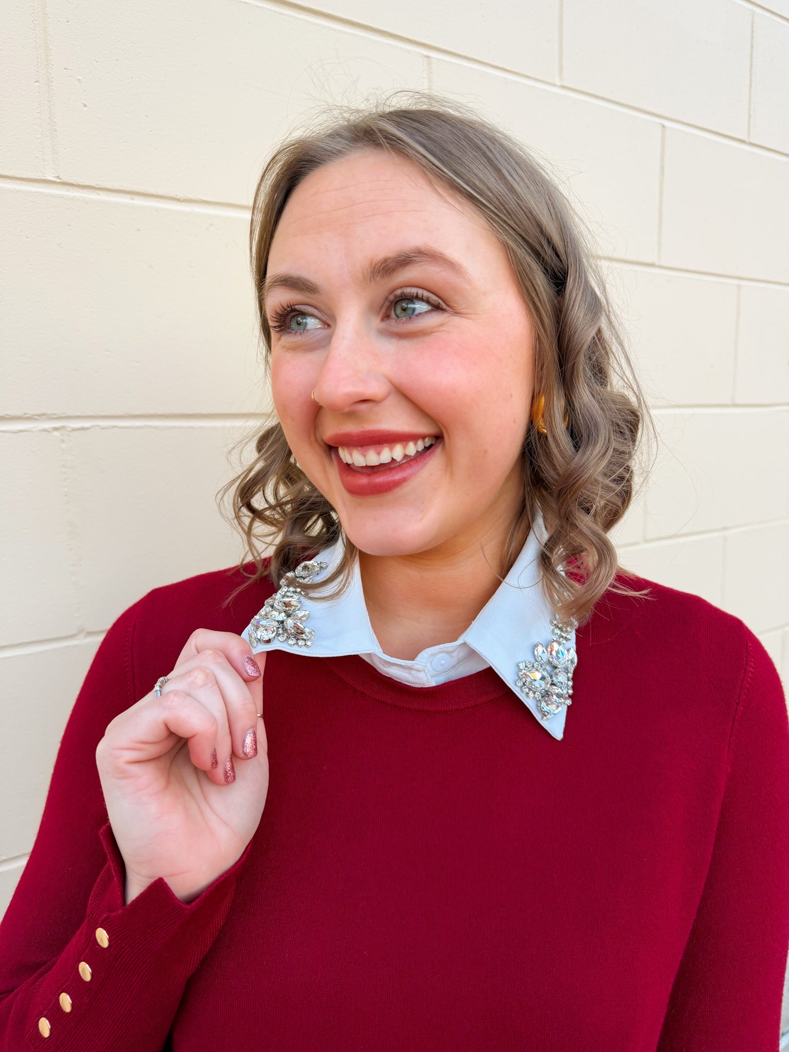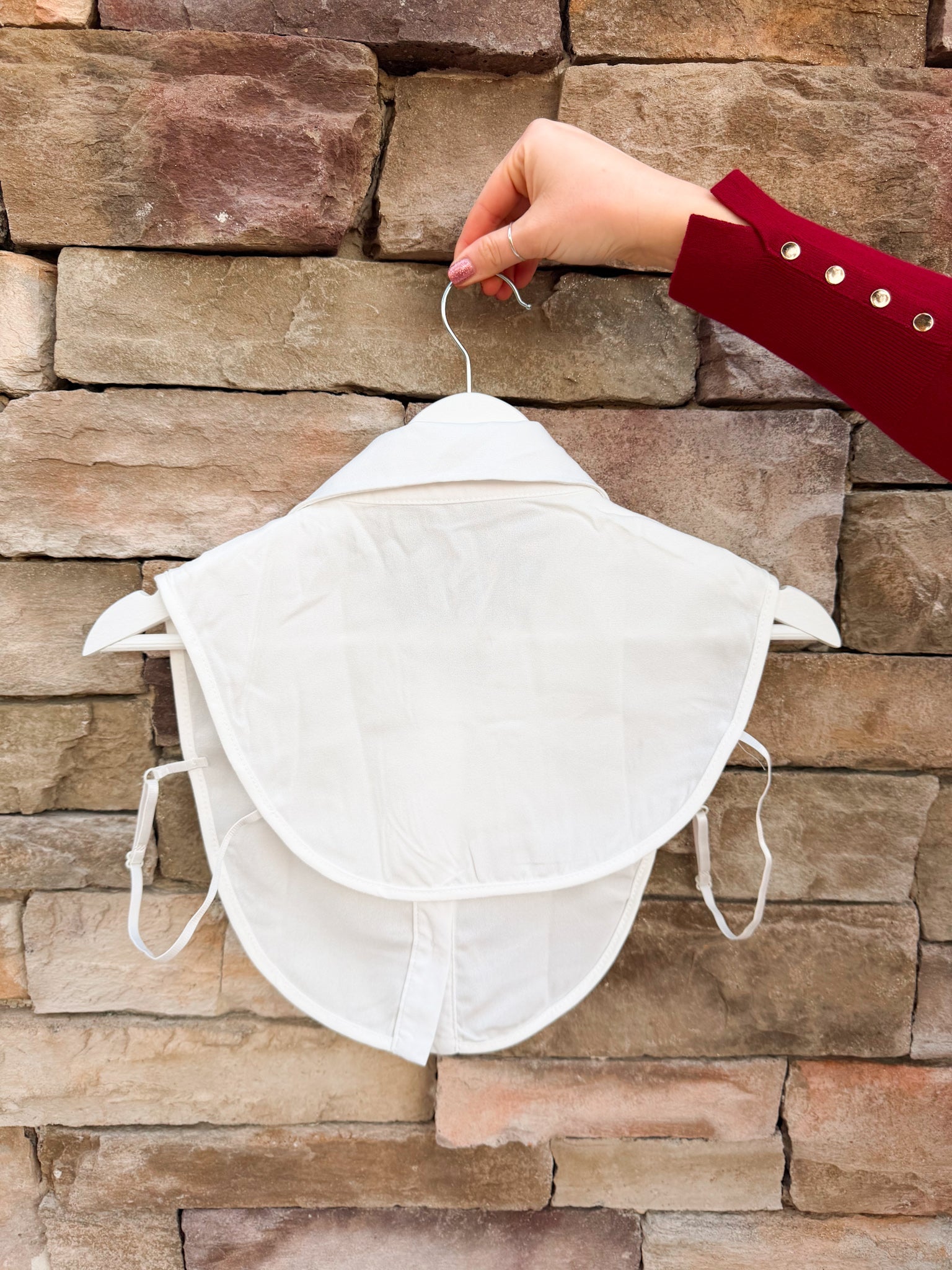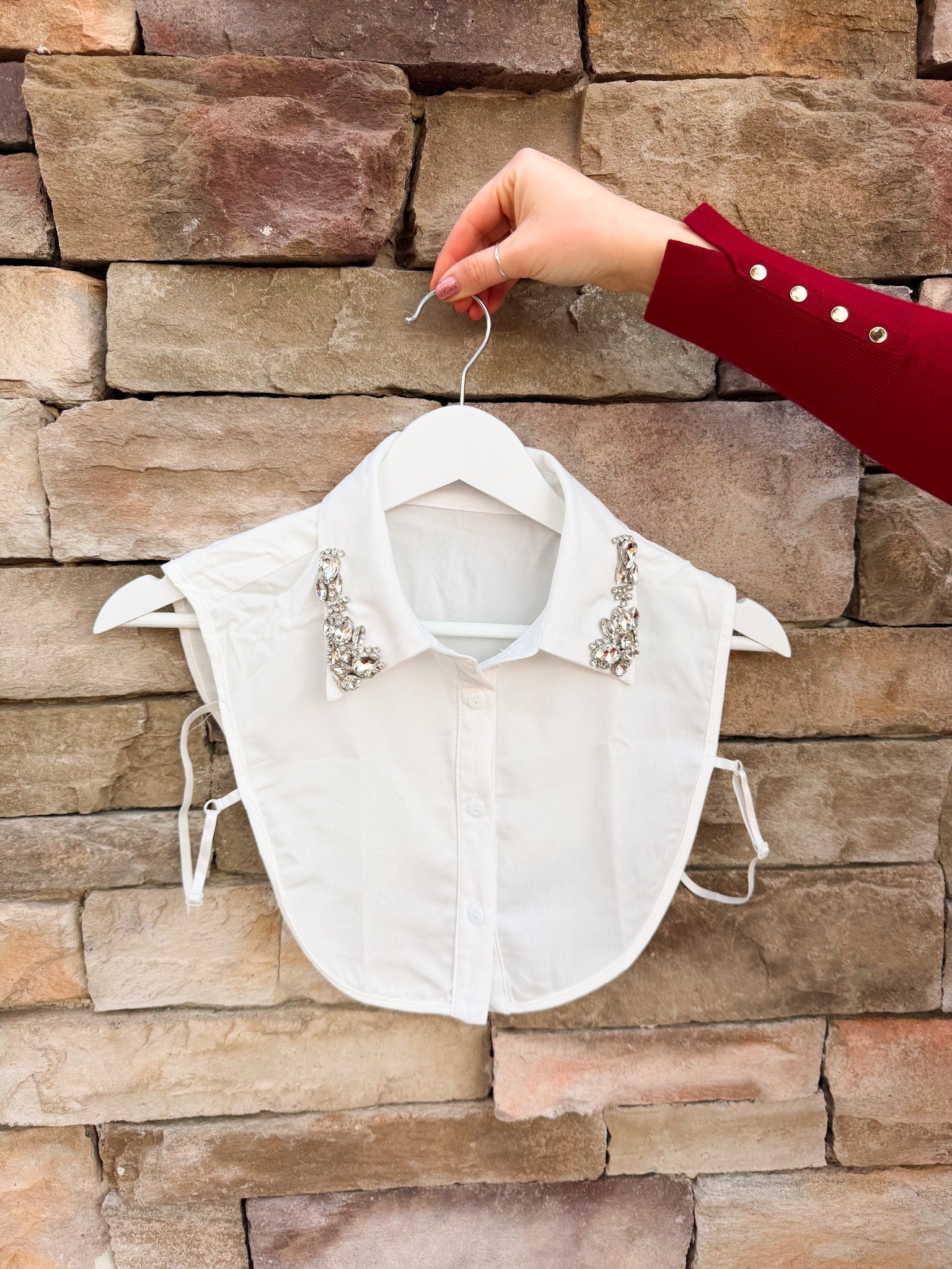 The White Faux Collar with Rhinestones is the little style secret that instantly elevates your look without adding bulk. Designed to give you the polished appearance of a perfectly layered shirt, this chic accessory slips effortlessly under sweaters, dresses, tees, and jackets for a refined, pulled-together finish. Sparkling rhinestone details add just the right touch of glamour, making it ideal for everything from everyday wear to holiday gatherings and special occasions. Adjustable side straps ensure a comfortable, customized fit so you can style it with confidence all day long.