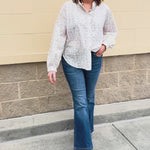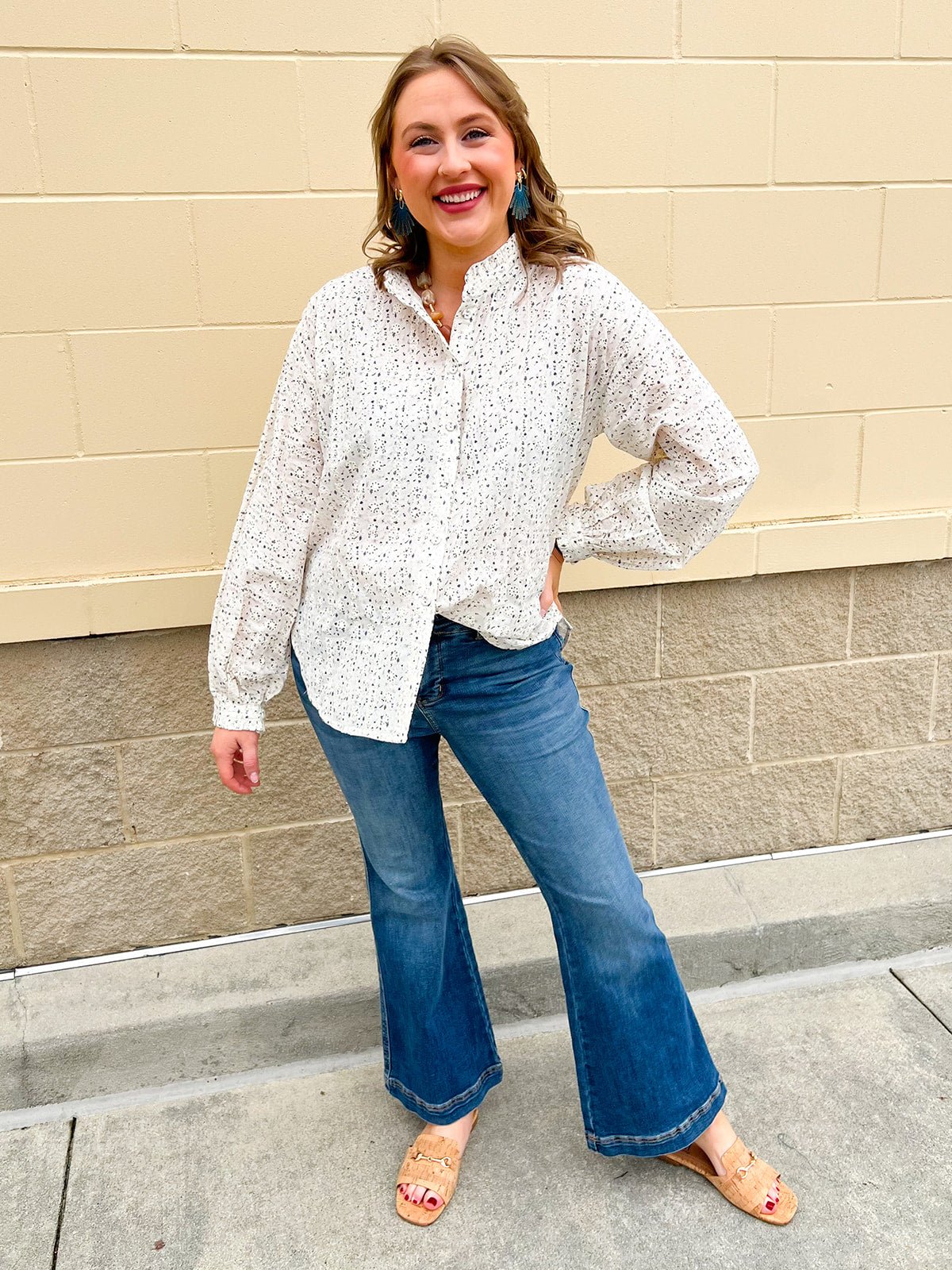 Elevate your everyday wardrobe with this feminine button-down top in a soft white multi pattern. Featuring a delicate Chinese ruffle neckline and long sleeves with subtle ruffle details, this shirt blends romantic charm with polished sophistication. Lightweight and textured, it drapes beautifully and transitions seamlessly from the office to weekend brunches. The button-down front adds classic structure, while the ruffled accents bring a modern, whimsical touch.