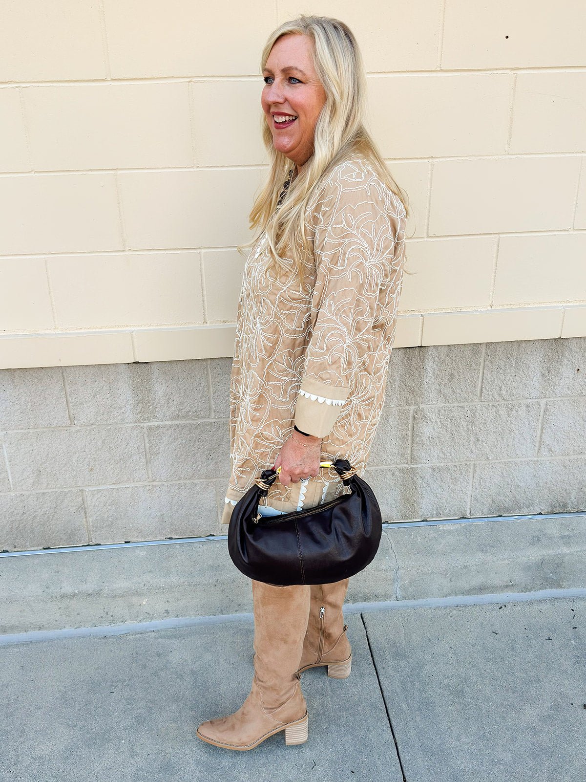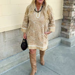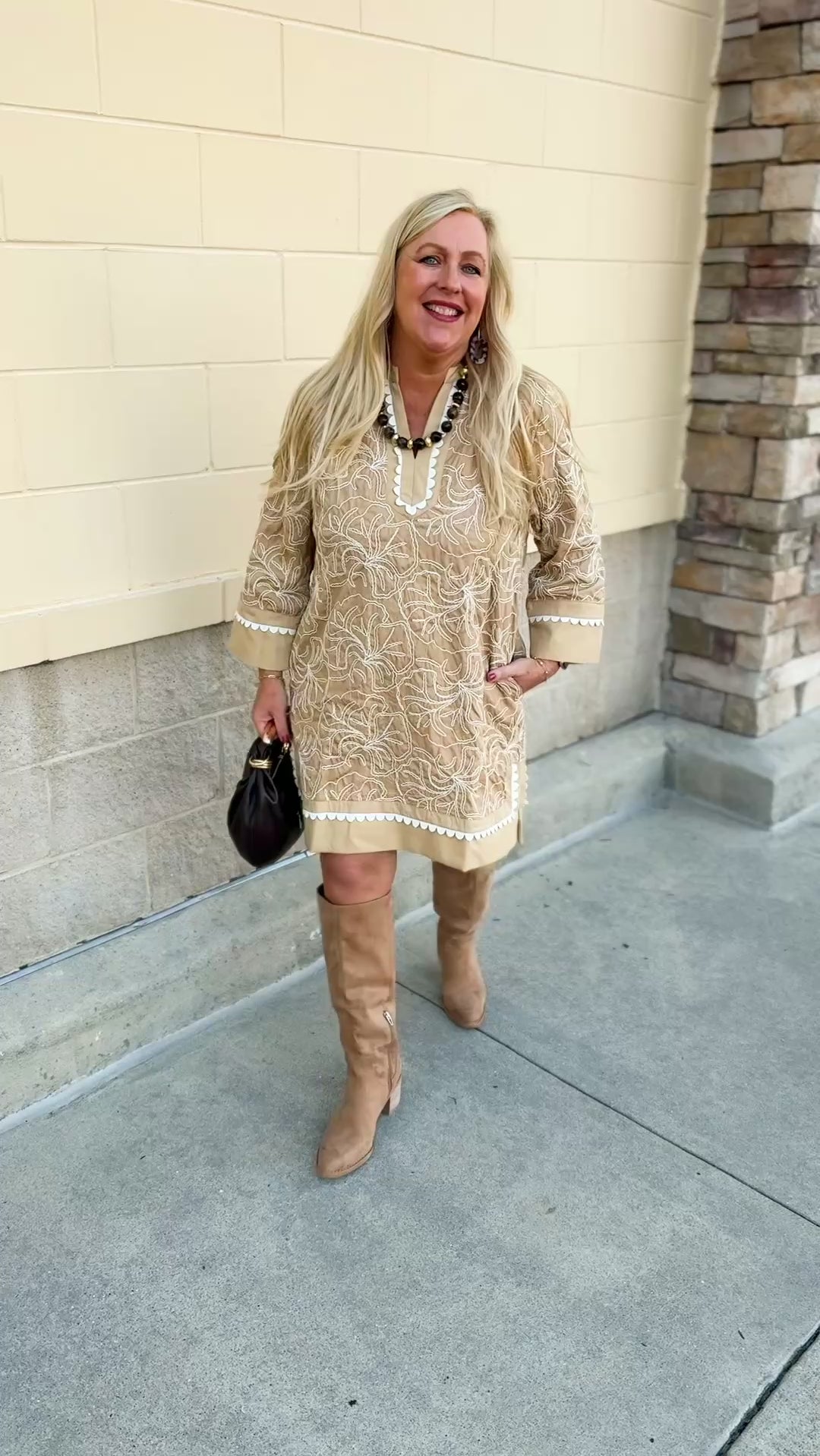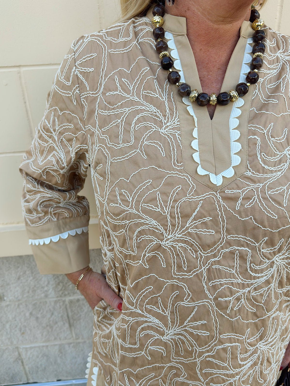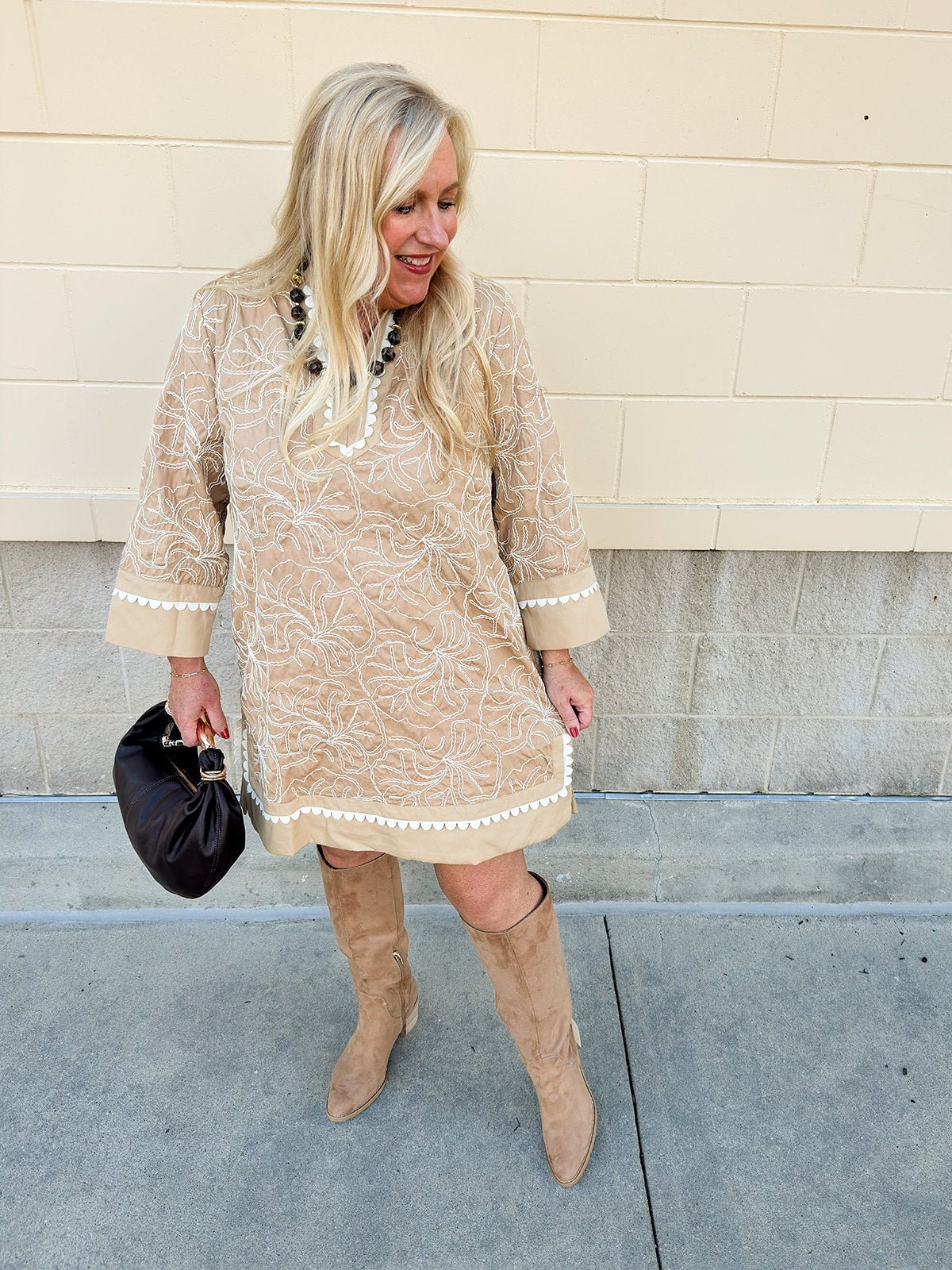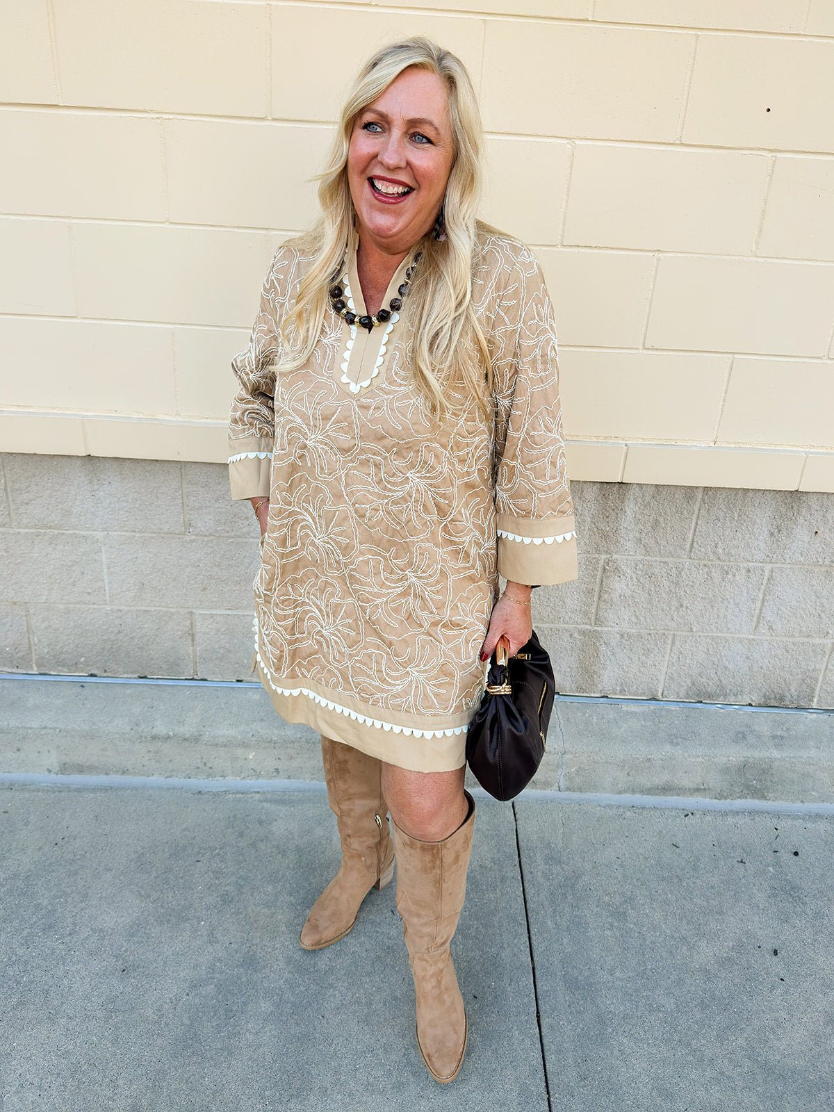 Looking for a dress that feels effortlessly elegant yet easy to wear? The Willow Grace Embroidered Notch Neck Dress brings together timeless detail and everyday comfort in the prettiest way. Made in a soft light tan hue, this dress features delicate white piping and scalloped trim that add subtle sophistication to its classic silhouette. The split notch neckline and 3/4 length sleeves make it a flattering choice for any season, while the gentle embroidery gives it a touch of artisanal charm. Lightweight and breezy, it’s perfect for brunches, showers, or simply adding a polished touch to your everyday look.