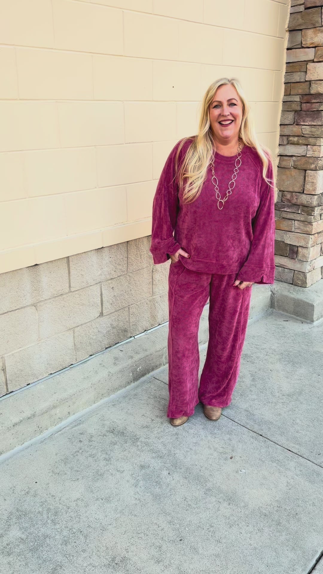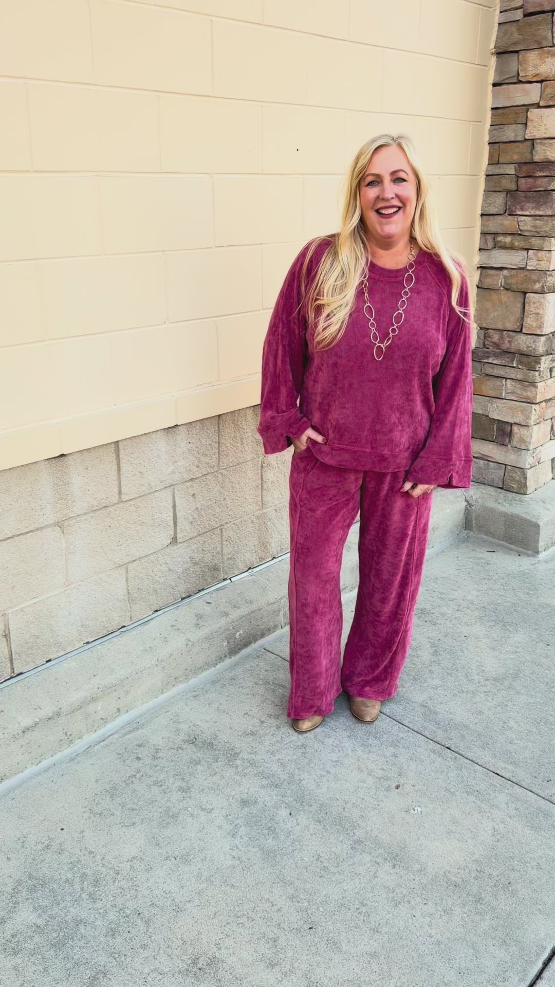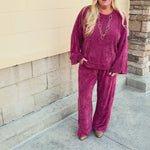 The pants offer a relaxed wide leg fit, adjustable drawstring waistband, and side seam pockets for everyday ease, while the knit top balances chic and cozy with raglan sleeves, a classic crew neckline, and a slightly high-low hem. The rich ruby red hue adds instant luxury, making this set perfect for holiday gatherings, date nights, or simply elevating your daily routine. Worn together, it’s striking and seamless; styled separately, it offers endless versatility. More than just loungewear, this set is a true wardrobe investment—luxurious, polished, and designed to make you feel empowered.