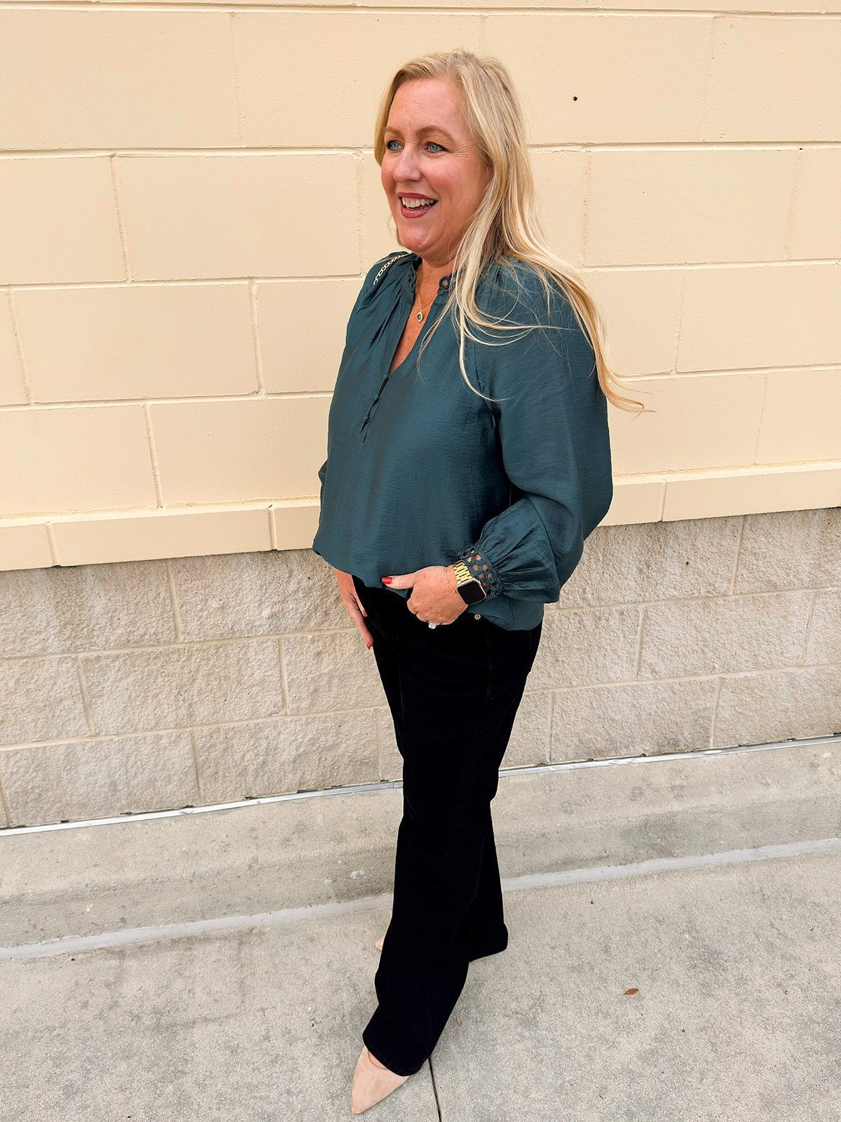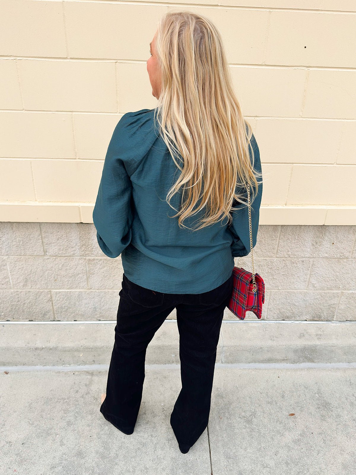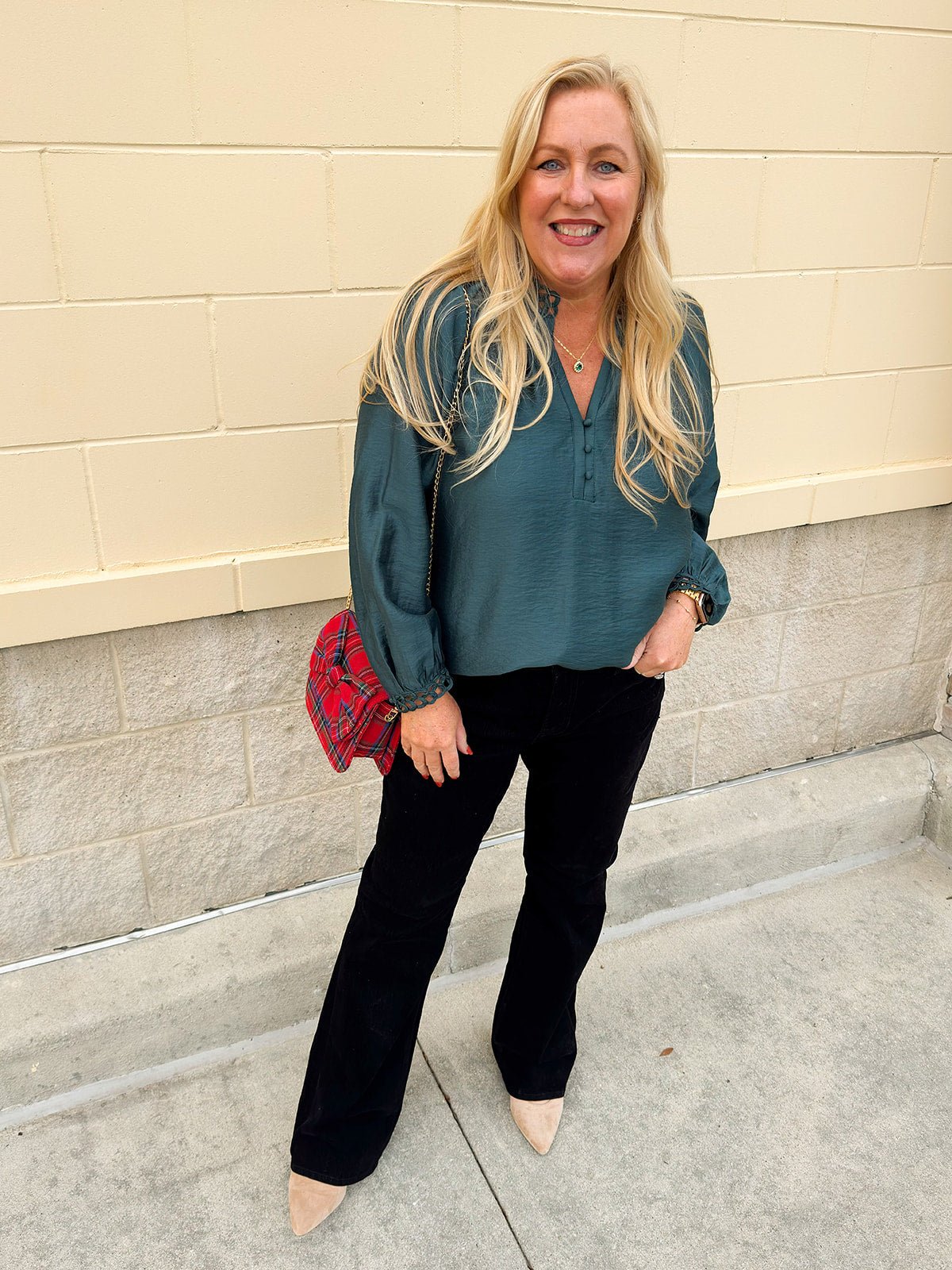Looking for a holiday and winter top that feels festive without being flashy—and lightweight enough to wear all season long? The Winter Whimsy Eyelet Trim Top in Blue brings that perfect balance of charm, comfort, and polished detail. Its soft long sleeves, delicate eyelet collar, and matching eyelet cuffs instantly elevate your outfit while keeping things sweet and feminine. The V-neckline is finished with covered buttons for a refined touch, giving you a look that’s equally gorgeous with denim, dress pants, or a velvet skirt. Lightweight and breathable, this is the winter top you’ll reach for when you want something pretty, effortless, and totally seasonal—ideal for holiday parties, office days, and cozy dinners out. Its icy winter-blue hue adds a fresh pop of color that still feels festive, making it a versatile staple for the entire season.