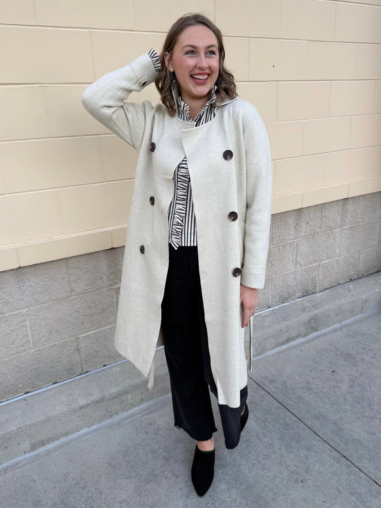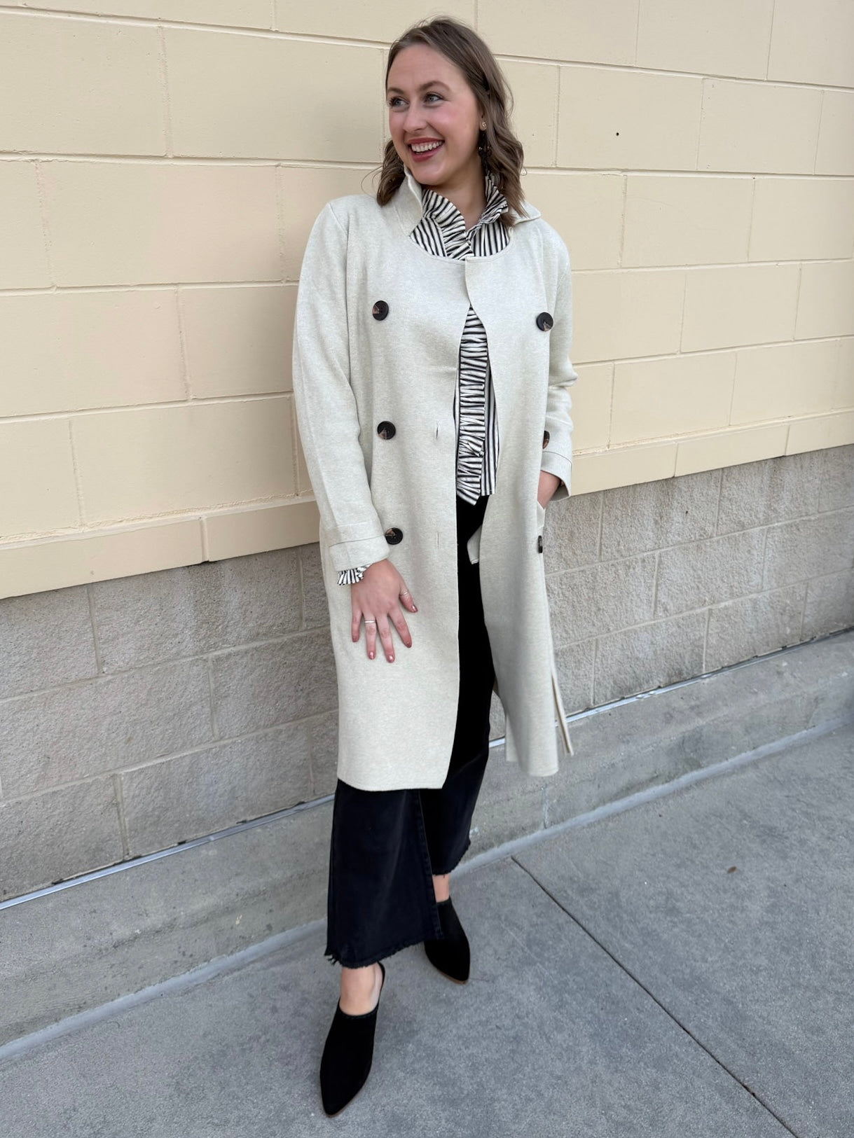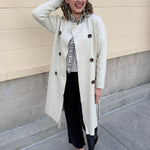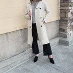 Looking for a coat that’s both timeless and effortlessly chic? The Winter Whisper Double-Collared Coat in Cream is the perfect layering piece for your winter wardrobe. Its long silhouette keeps you cozy while exuding sophistication, and the double-collared neckline adds a polished, structured touch. Four decorative buttons along the front bring subtle elegance, while cuffed sleeves and convenient side pockets combine style with practicality.